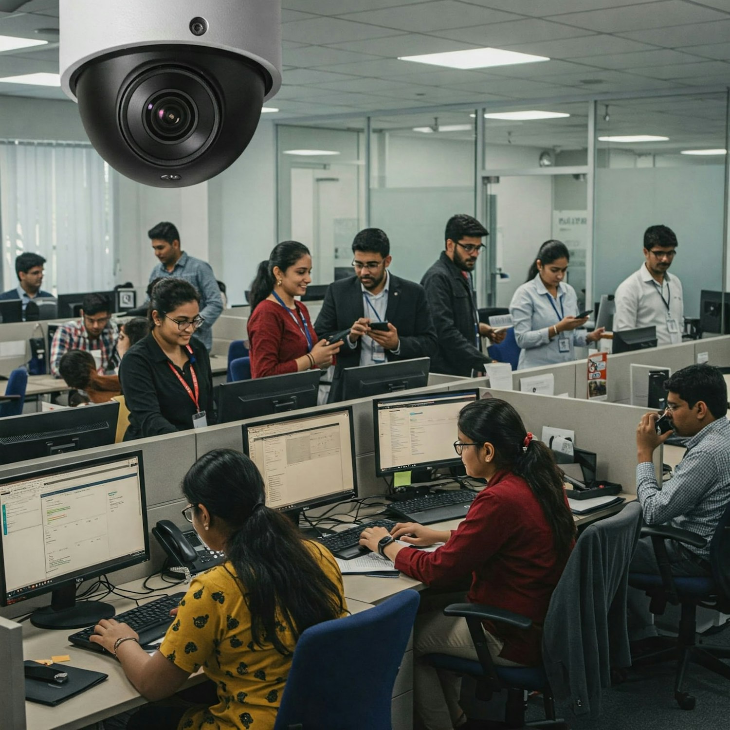 Modern office with employees working at desks and collaborating, under the watch of a prominent dome security camera.