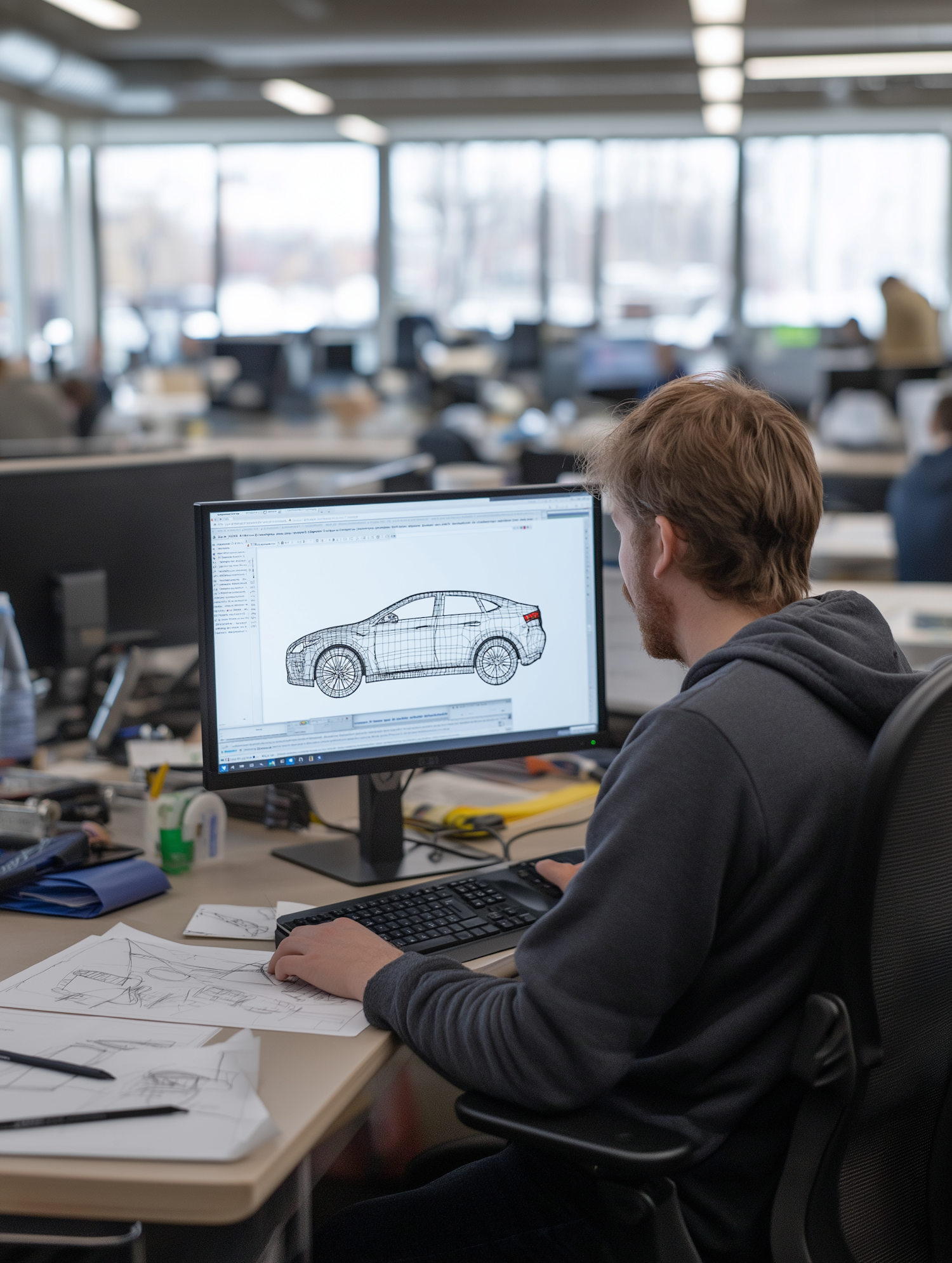 Man working on car design in a modern office, focused on a computer screen with a wireframe model. Creative and collaborative workspace.