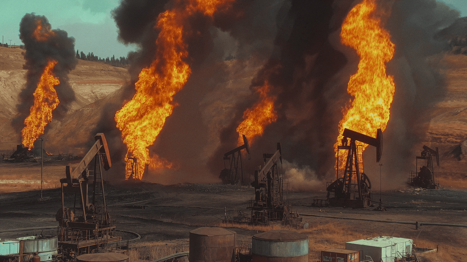 Dramatic scene of an oil field fire with pumpjacks, towering flames, and thick smoke against an arid landscape.
