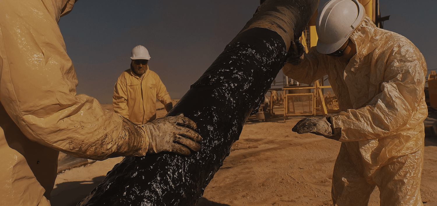 Workers in yellow protective suits handle an oil-coated pipe in a desert industrial site, emphasizing safety and teamwork in harsh conditions.