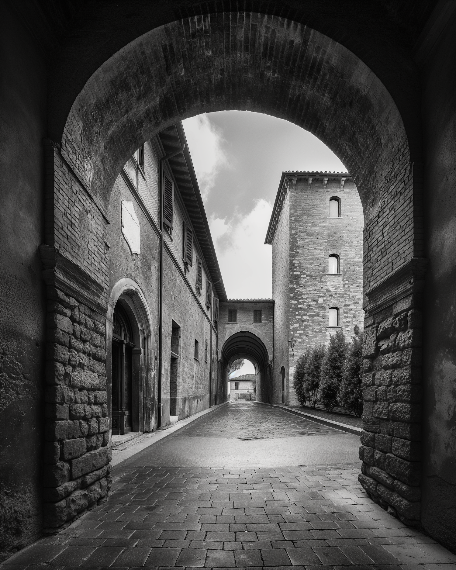 Black and white photo of a cobblestone street framed by an arched brick passageway, showcasing historic architecture and depth.