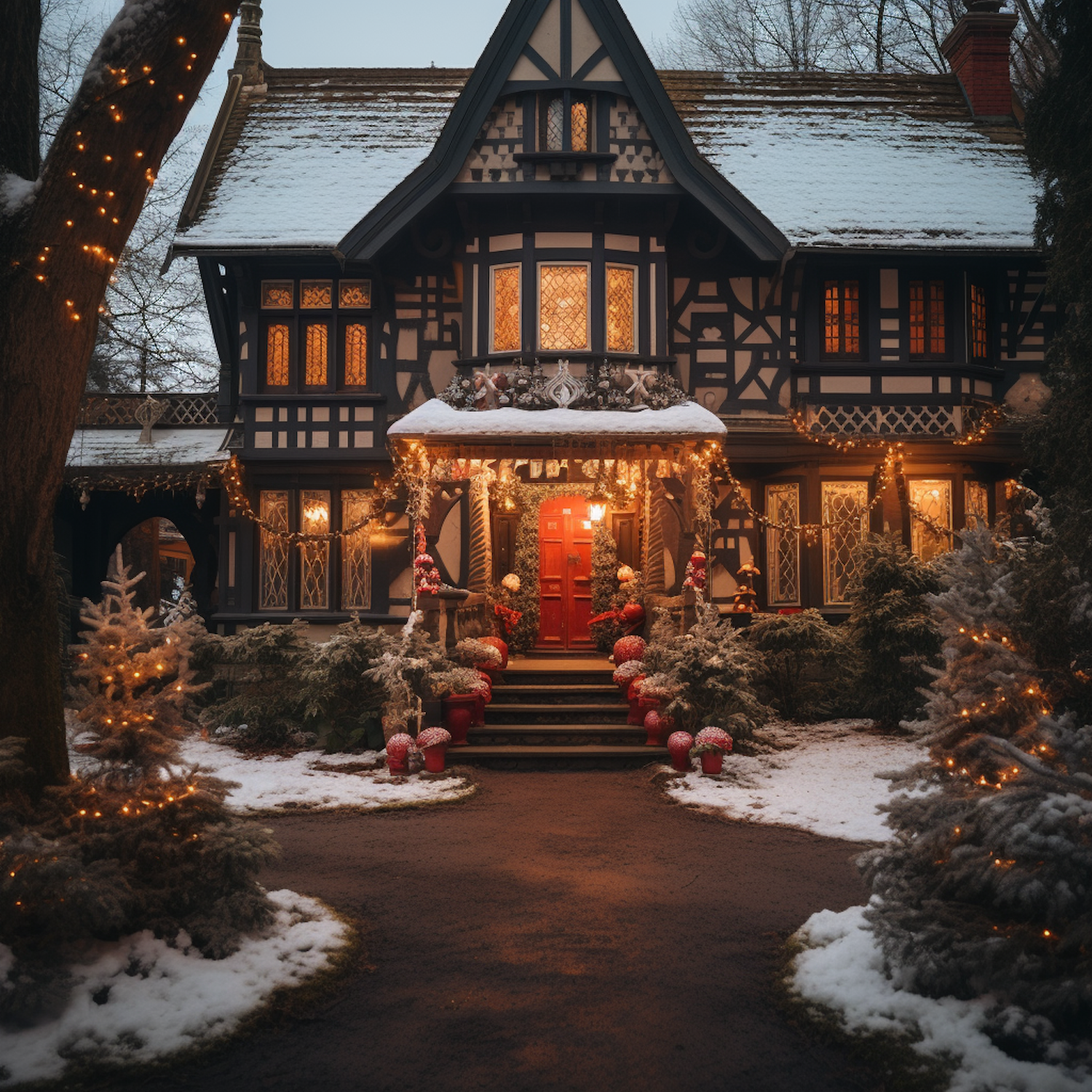 Charming Tudor-style house with festive Christmas lights, snow-dusted roof, and a welcoming red door, creating a cozy winter scene.