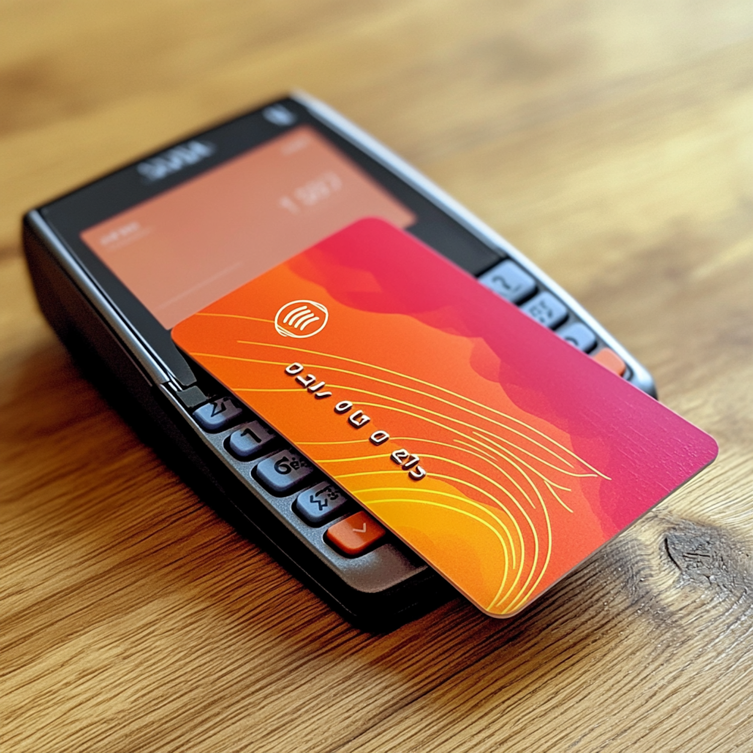 Close-up of a vibrant orange credit card making a contactless payment on a card reader, set on a wooden surface.