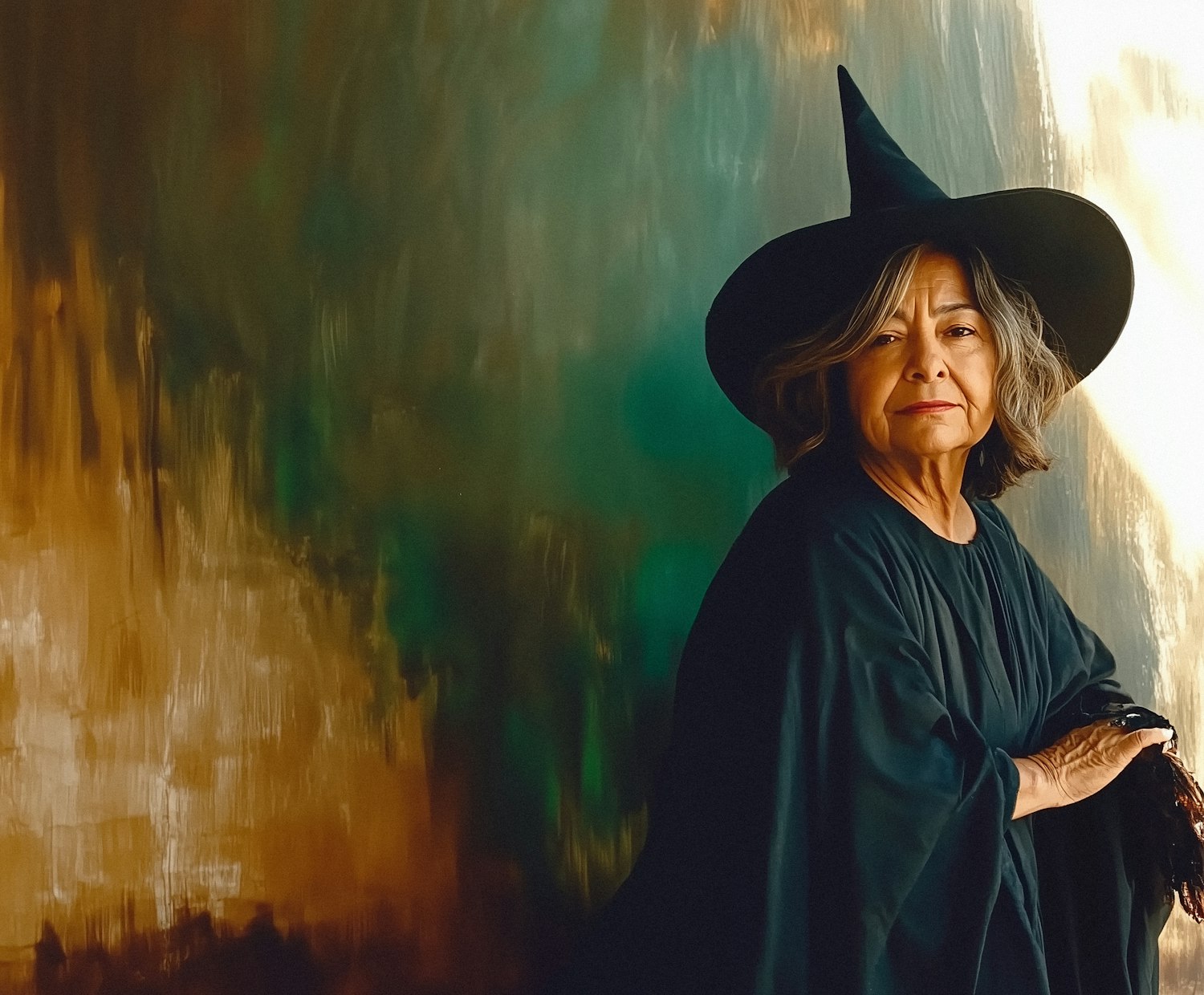 Elderly woman in a witch's hat and robe against a blurred earthy background, exuding a mystical and serene aura.