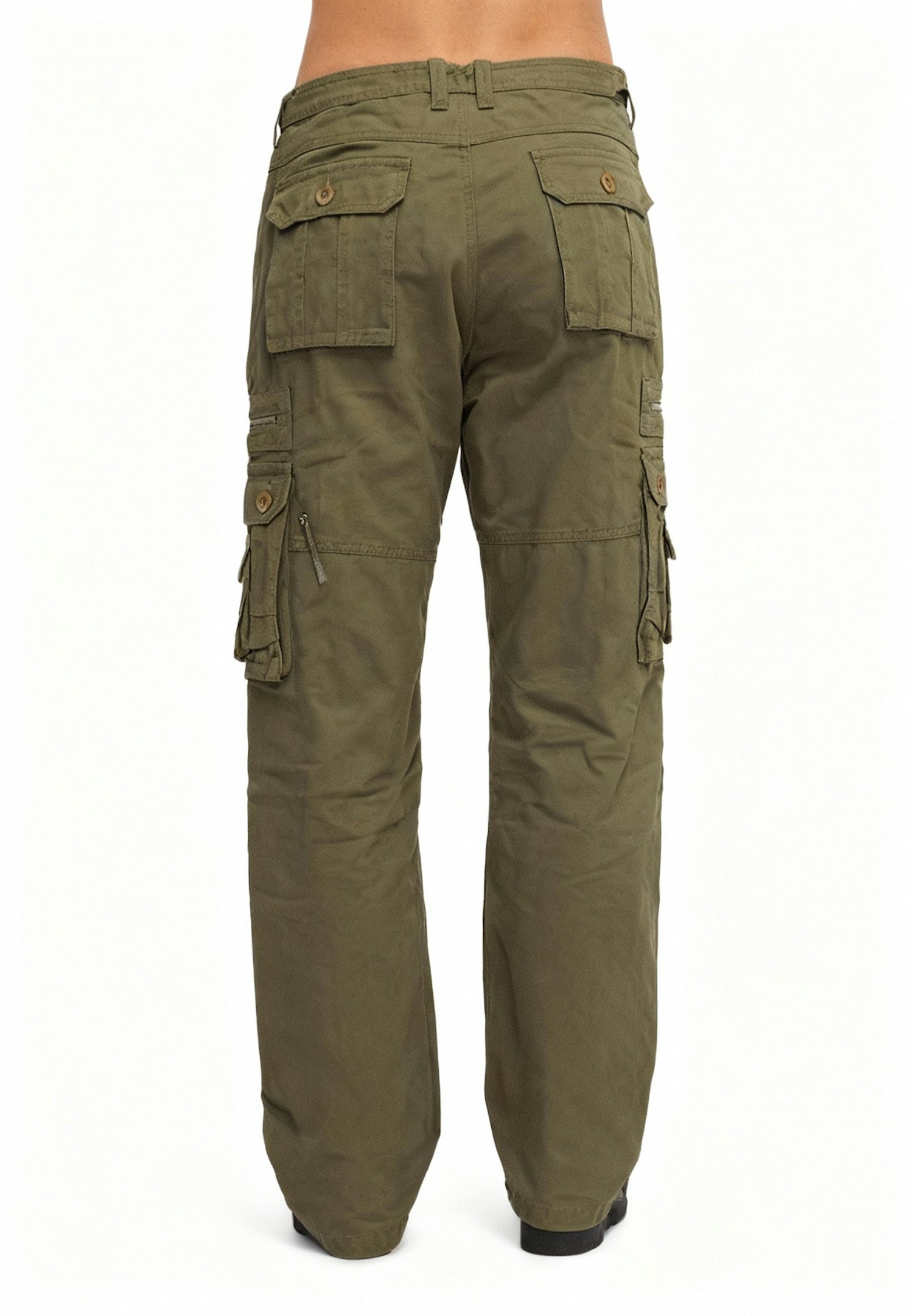 Olive green cargo pants with multiple pockets, shown from the back, highlighting their functional and stylish design.