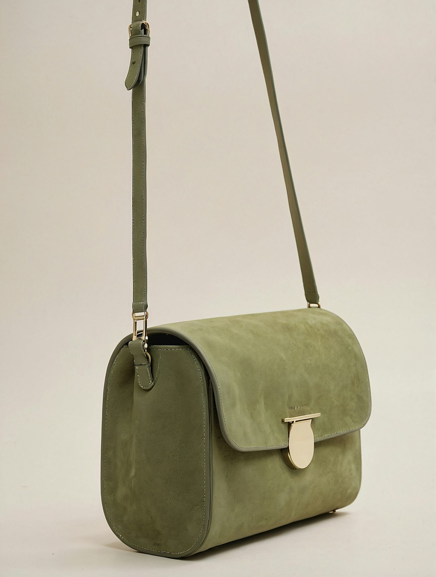 Elegant olive green suede crossbody bag with gold clasp and adjustable strap, perfect for a chic and minimalist look.