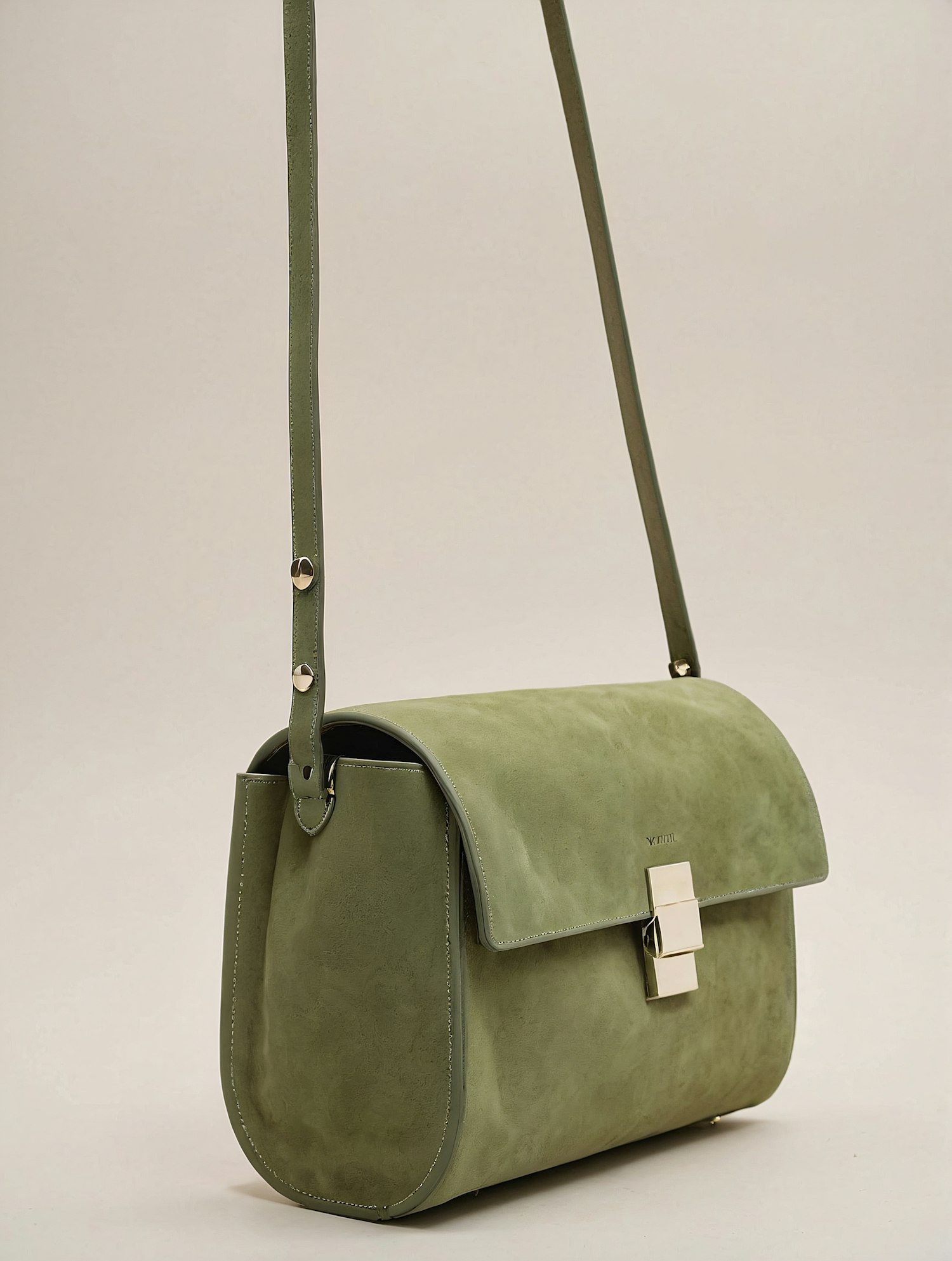 Elegant olive-green leather handbag with a gold clasp and adjustable strap, perfect for a chic and versatile accessory.