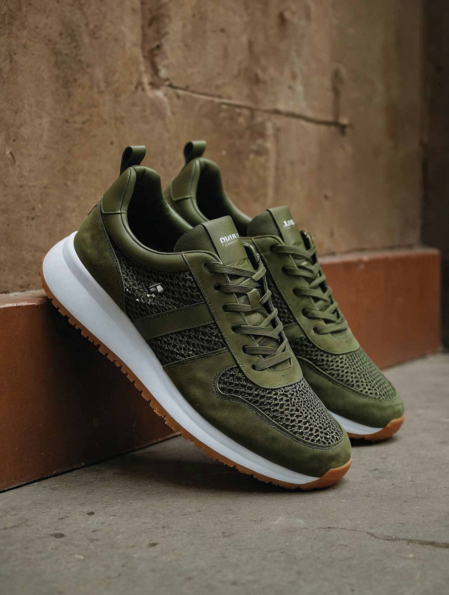Olive green sneakers with suede and mesh design, white midsoles, and gum outsoles, perfect for a casual yet stylish look.