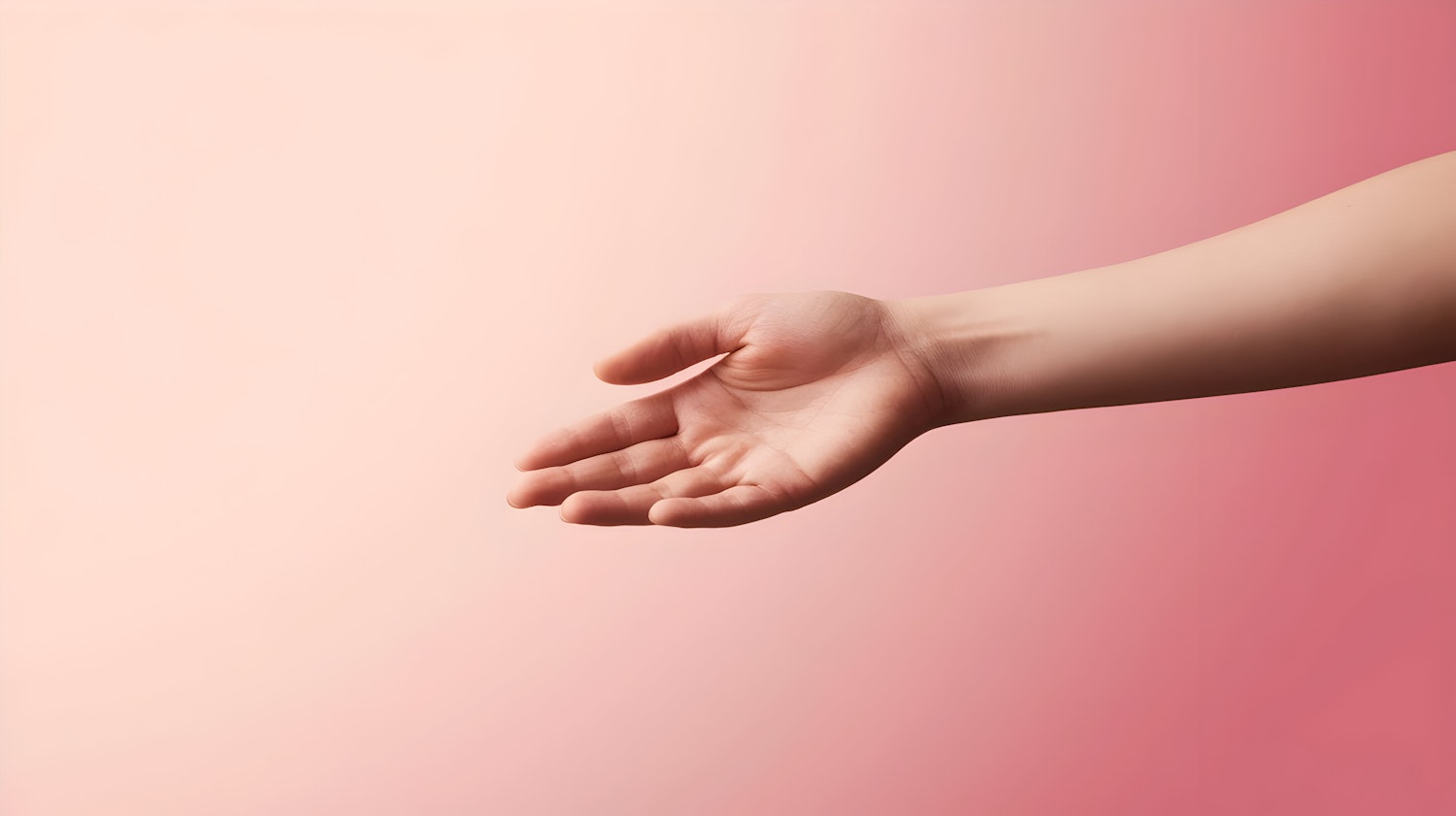 An open hand with a light skin tone against a soft pink-to-peach gradient background, symbolizing offering or connection.