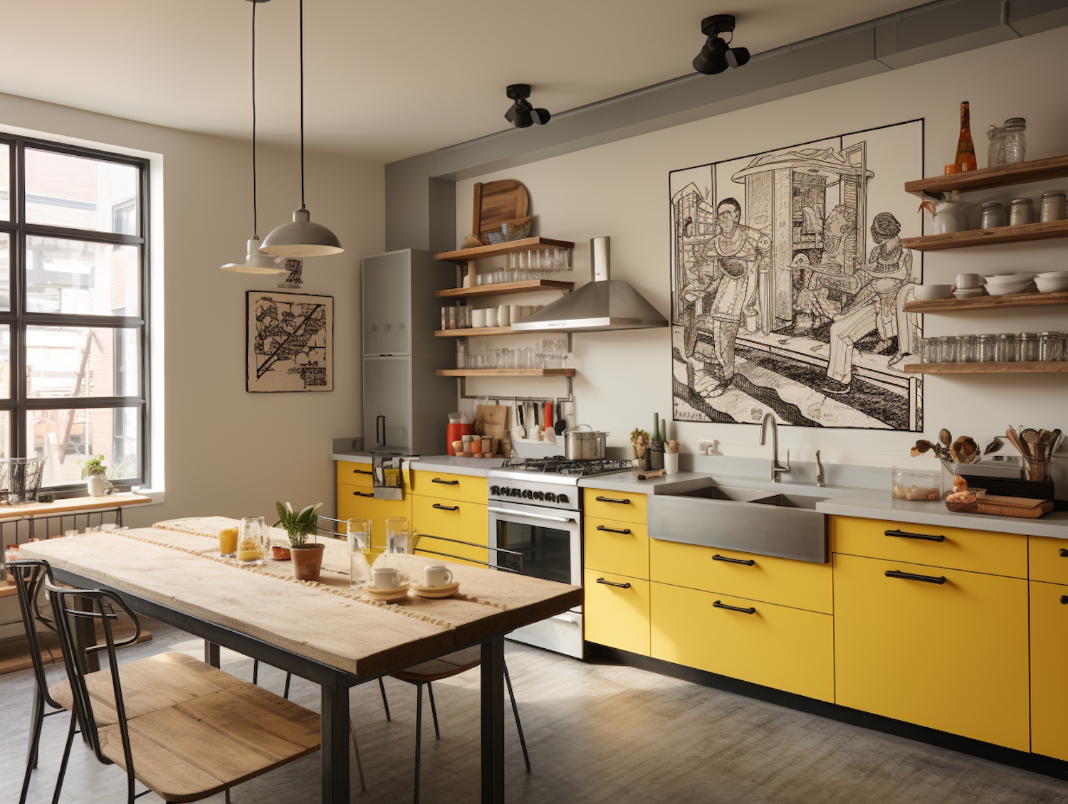 Bright kitchen with yellow cabinets, rustic dining table, industrial window, and creative wall art for a modern, cozy vibe.