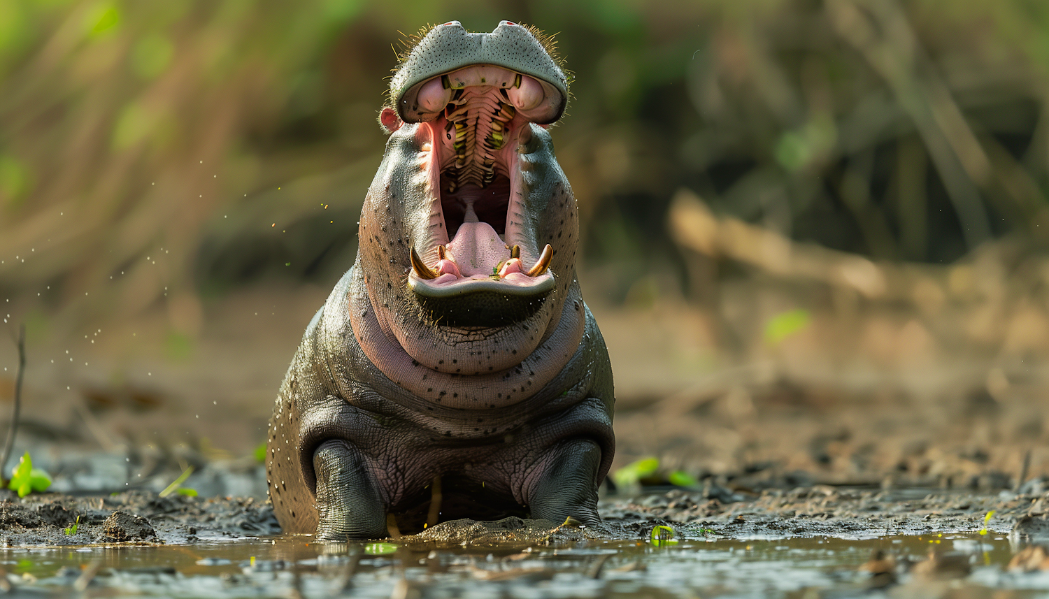 Close-up of a hippo with mouth wide open, showcasing large teeth and wet skin, set against a blurred natural background.