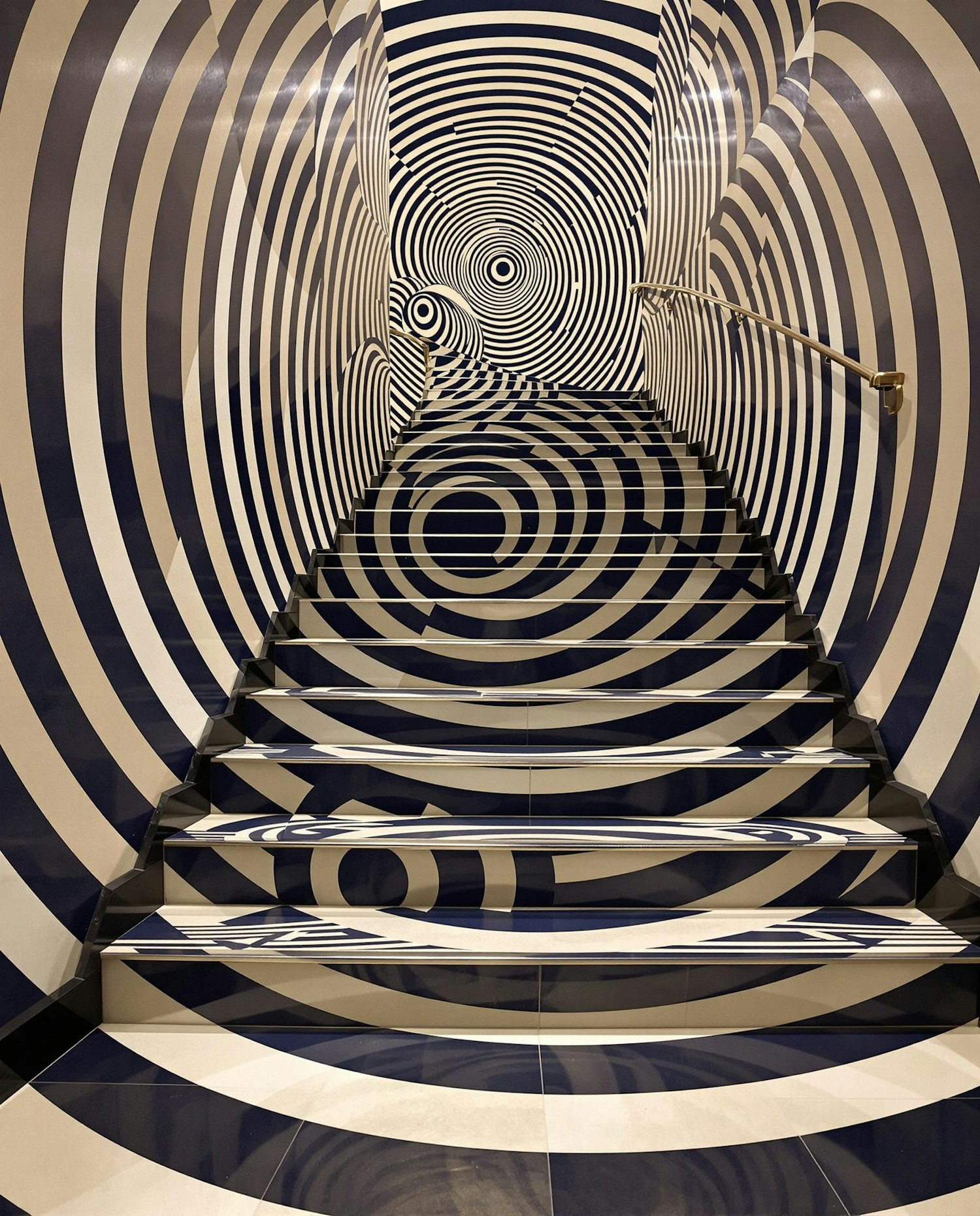 Staircase enveloped in an optical illusion pattern of concentric circles in navy and cream, extending from floor to ceiling. Dramatic downlight accentuates the rhythmic visual effect.
