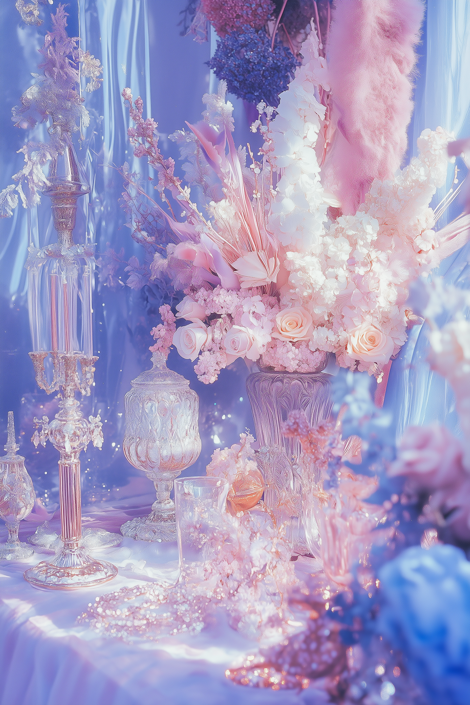 Ethereal floral arrangement with pastel pinks and blues, ornate glassware, and shimmering light for a dreamy, romantic ambiance.