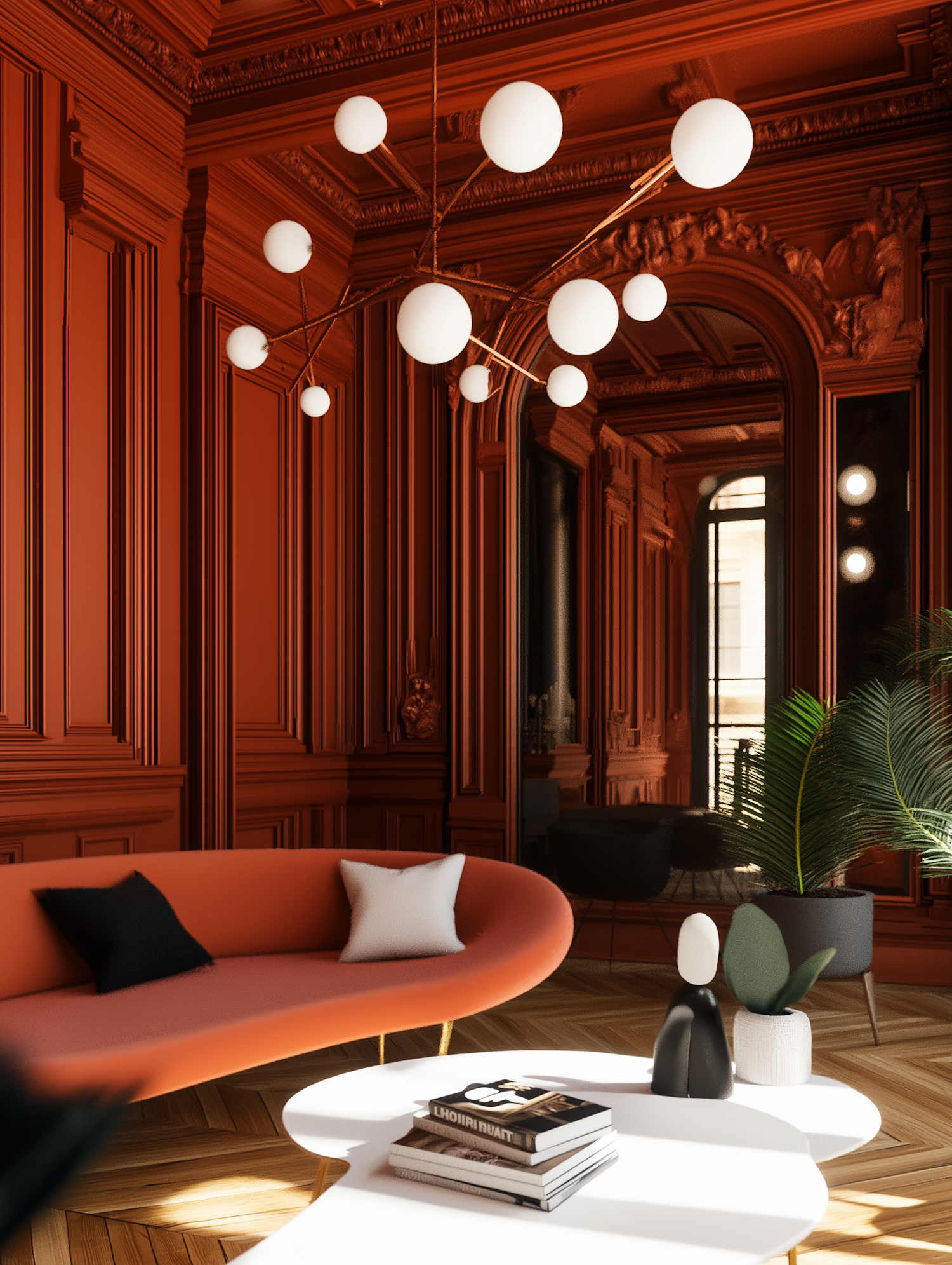 Luxurious room with ornate orange paneling, modern chandelier, curved sofa, and stylish decor elements.