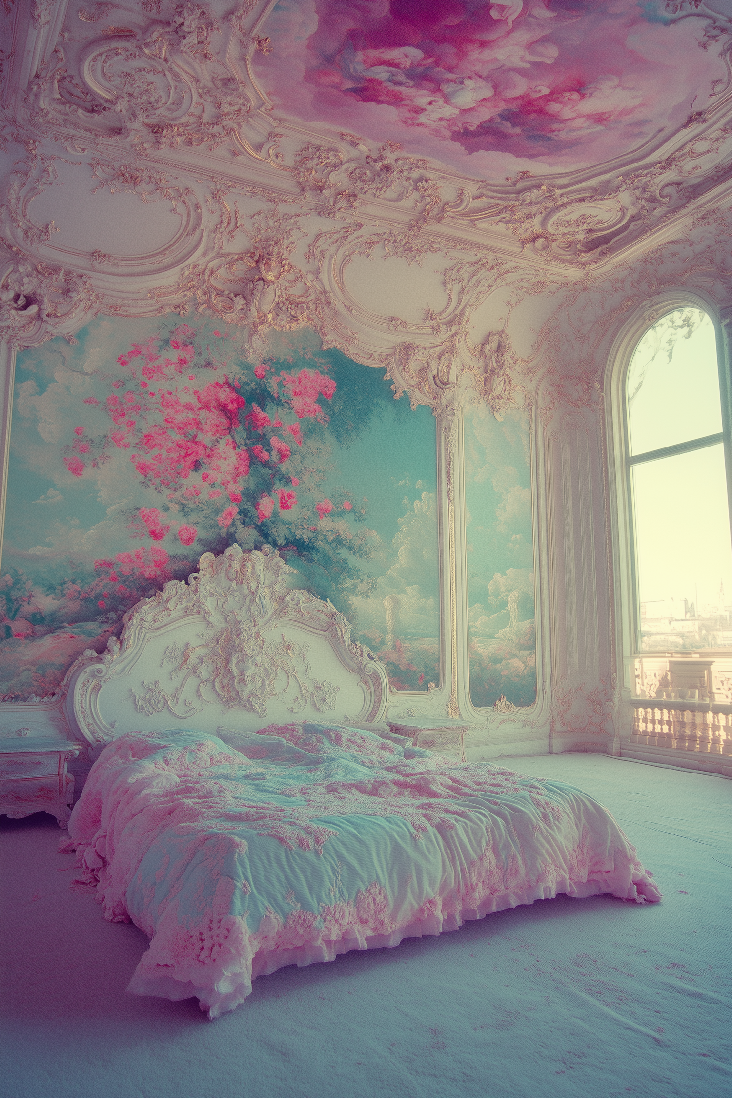 Luxurious bedroom with ornate baroque design, pastel frescoes, and a plush pink bed, creating a dreamy, fairy-tale ambiance.