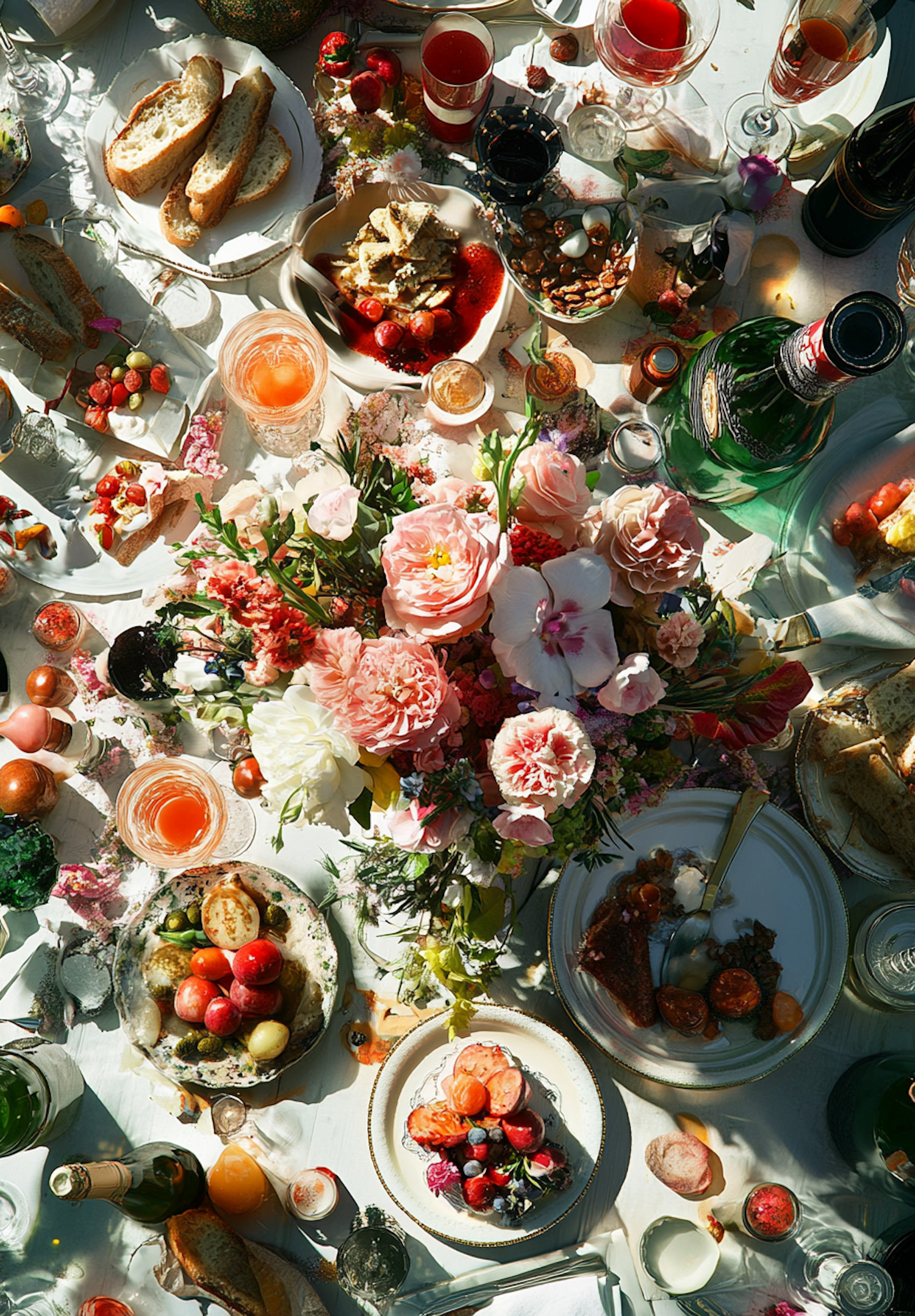 A vibrant table setting with colorful dishes, drinks, and a floral centerpiece, creating an elegant and festive atmosphere.