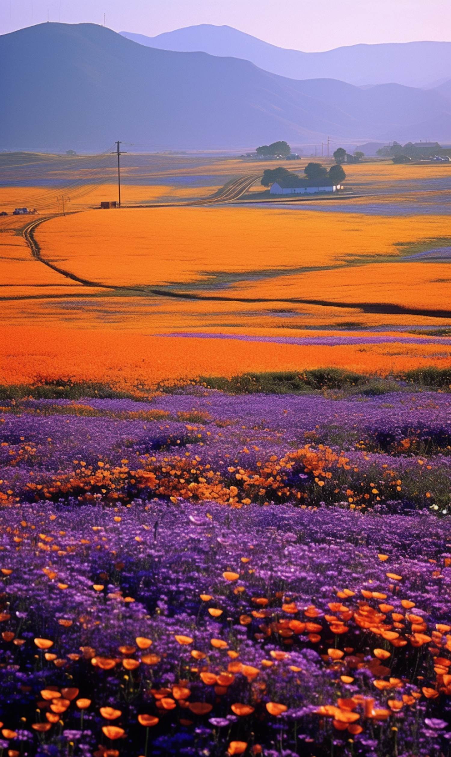 Vibrant fields of purple and orange wildflowers stretch to distant hills under a hazy sky, creating a serene and colorful landscape.