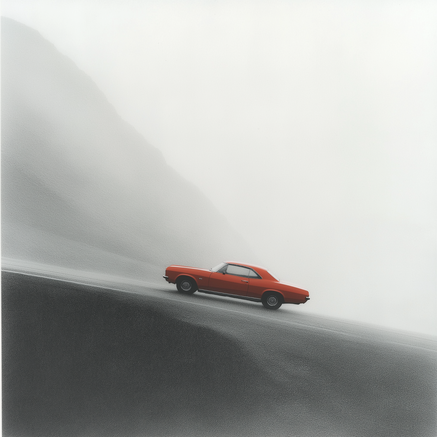 A classic orange car ascends a misty mountain road, its vibrant color contrasting the foggy, gray surroundings in a dramatic scene.