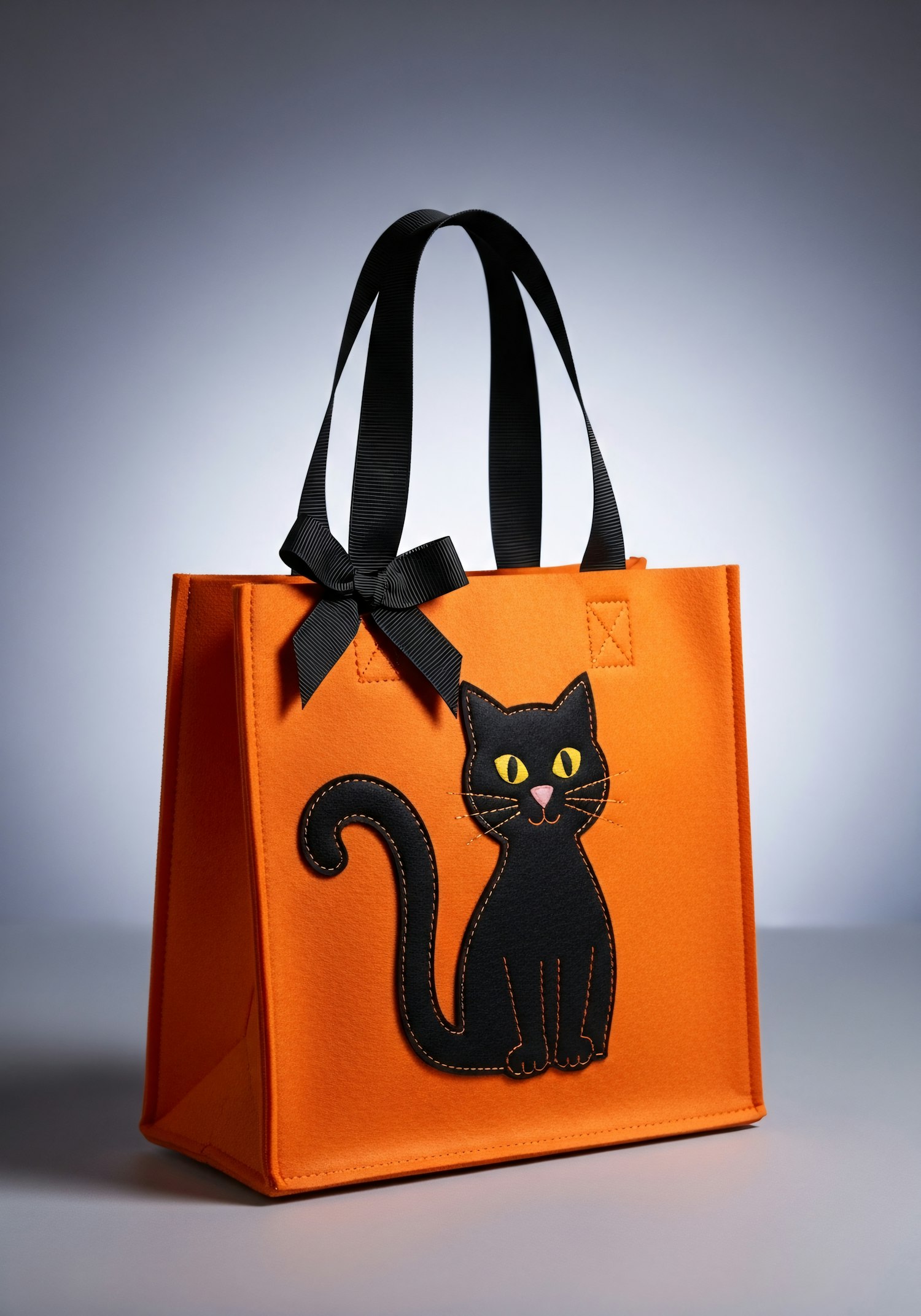 Bright orange tote bag with a black cat design and ribbon handles, perfect for a playful yet stylish accessory.