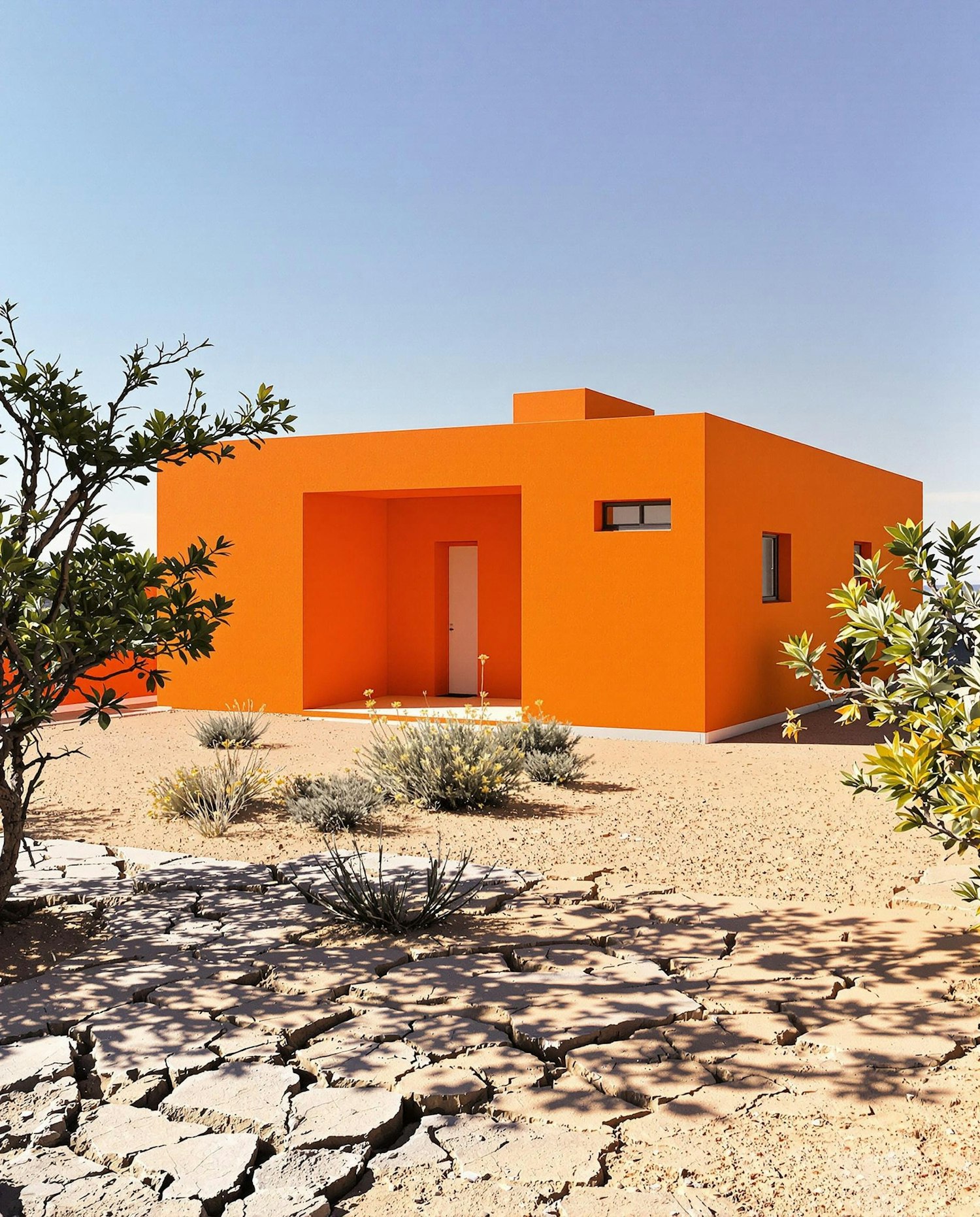 Bright orange minimalist house in a desert setting with cracked earth, sparse vegetation, and a clear blue sky.