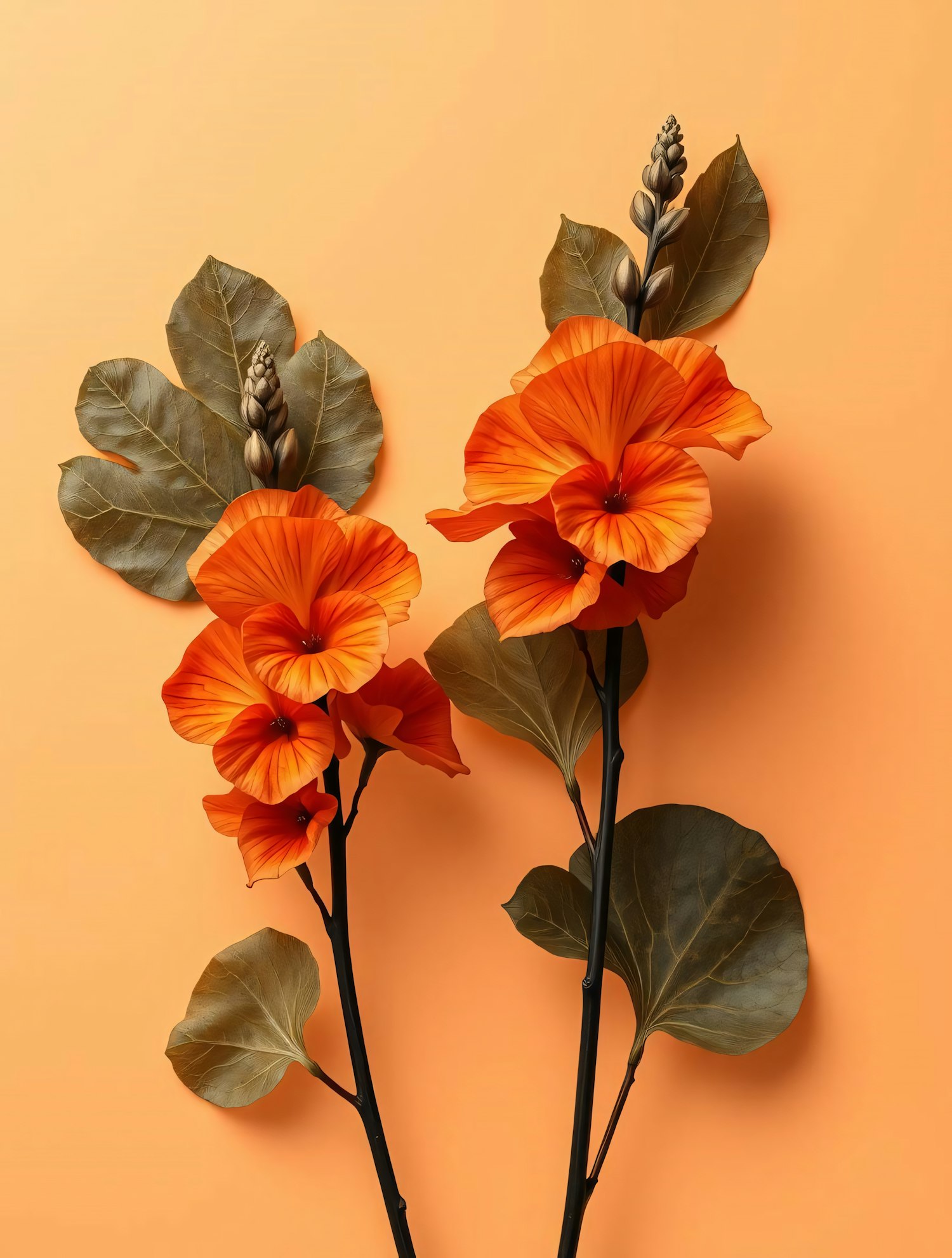 Bright orange flowers with green leaves on a soft orange background, creating a vibrant and minimalistic floral composition.