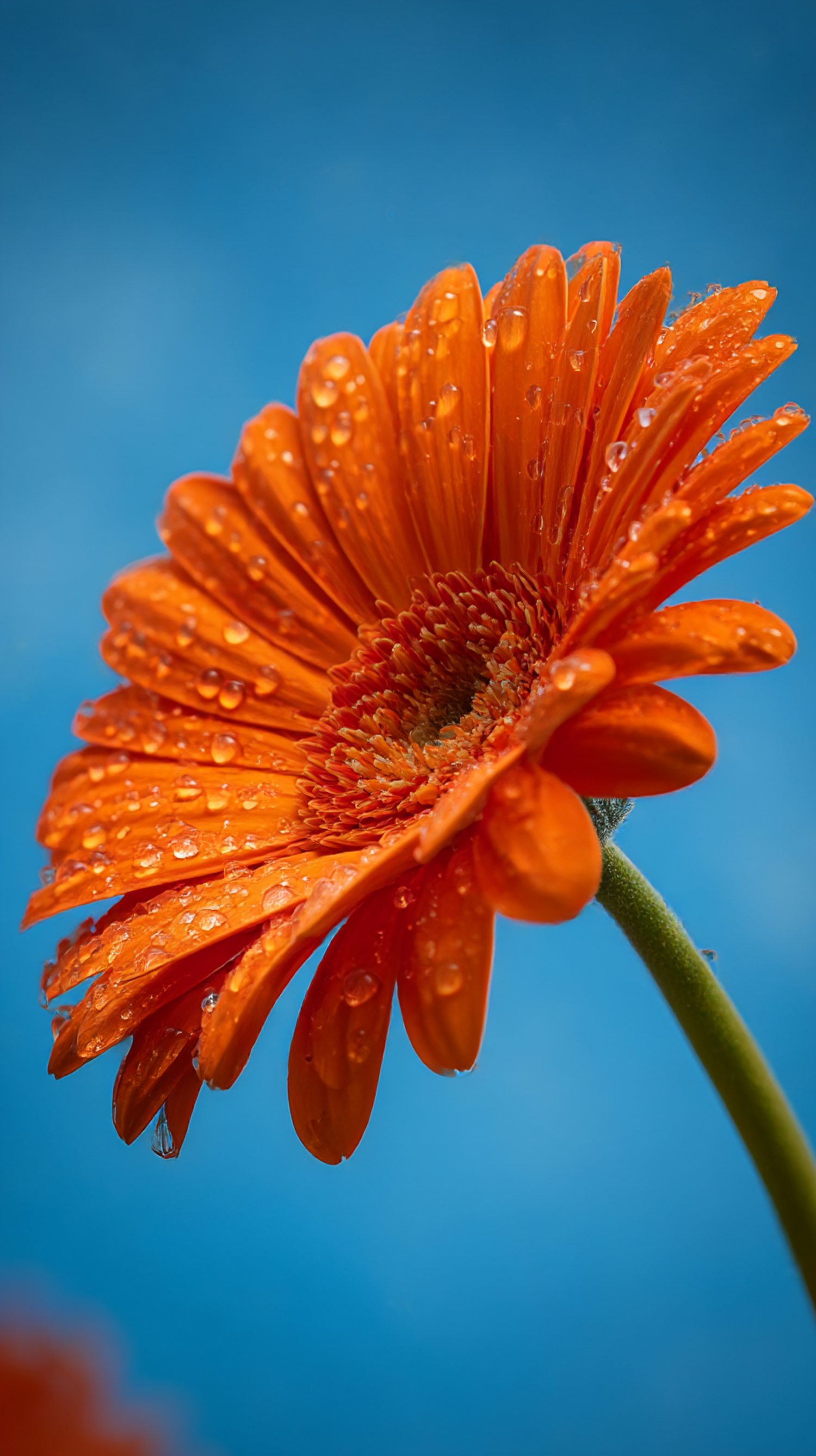 Close-up of an orange gerbera daisy with water droplets against a blue sky, showcasing vibrant colors and intricate petal details.
