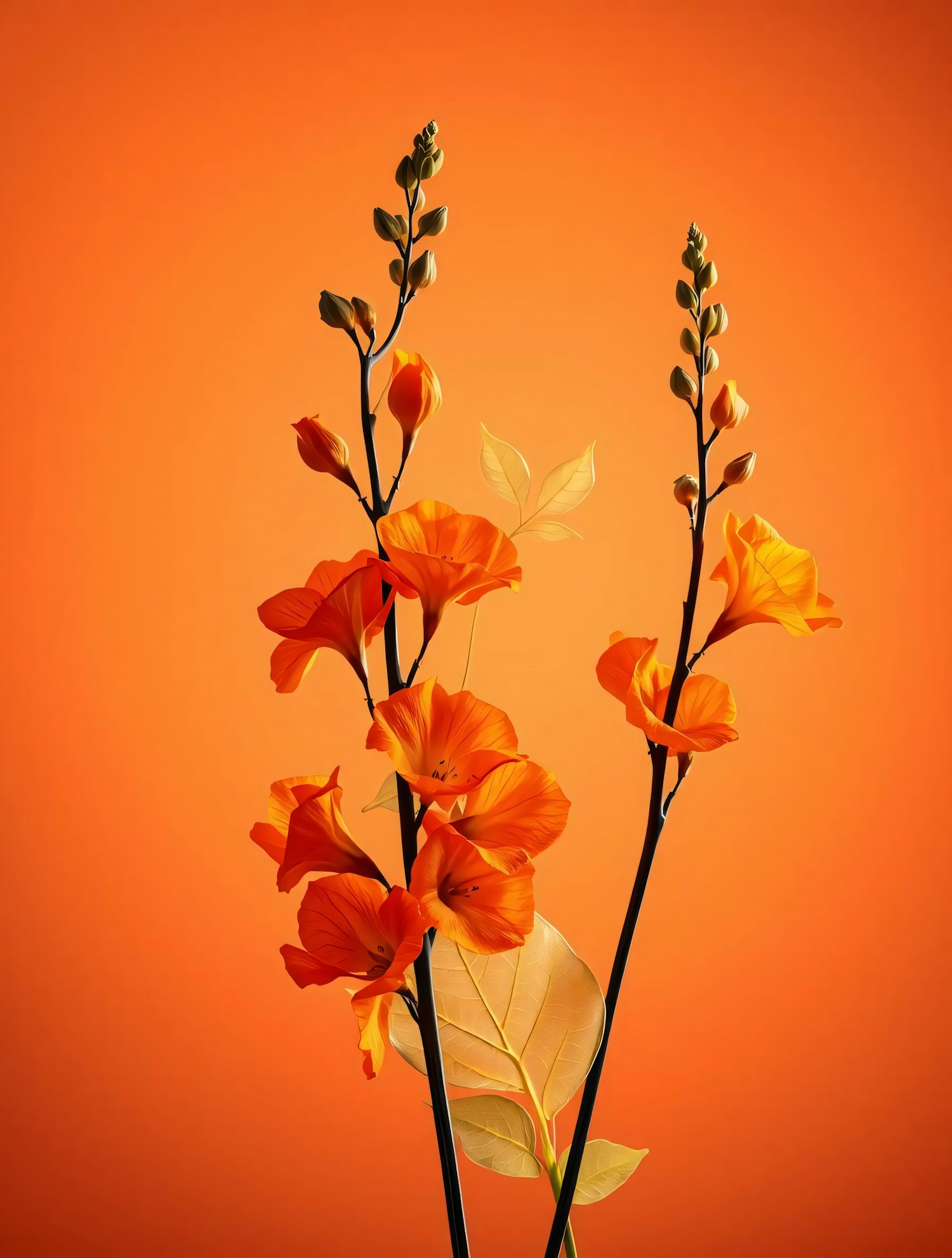 Bright orange gladiolus flowers in full bloom against a matching orange gradient background, creating a warm and vibrant aesthetic.
