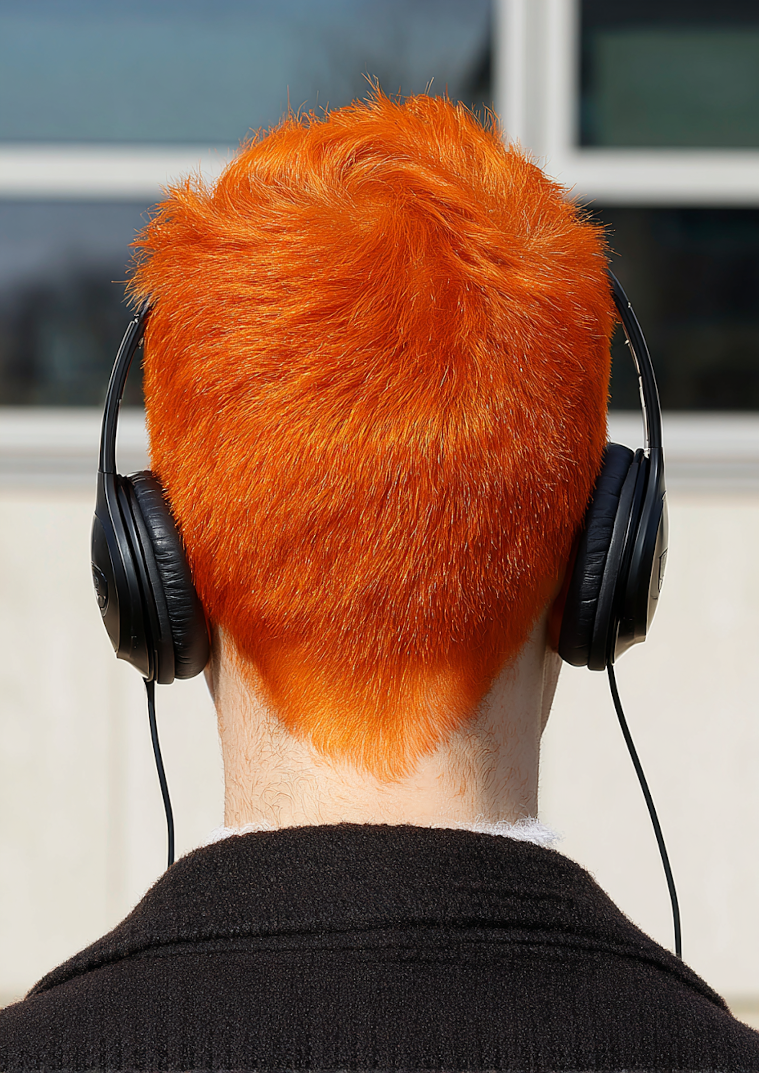 A person with bright orange hair wearing black headphones, seen from behind, outdoors with a blurred building in the background.