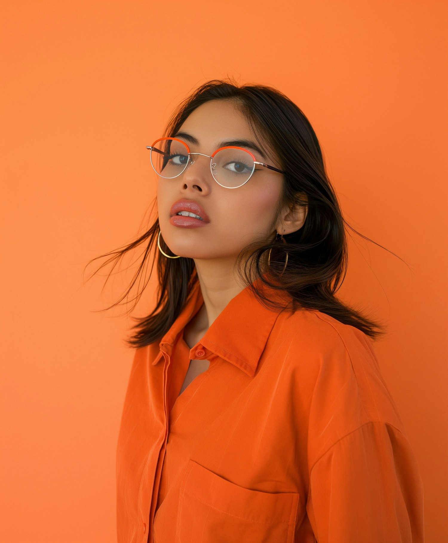 Asian woman in orange shirt and glasses against a vibrant orange background, creating a striking monochromatic look.