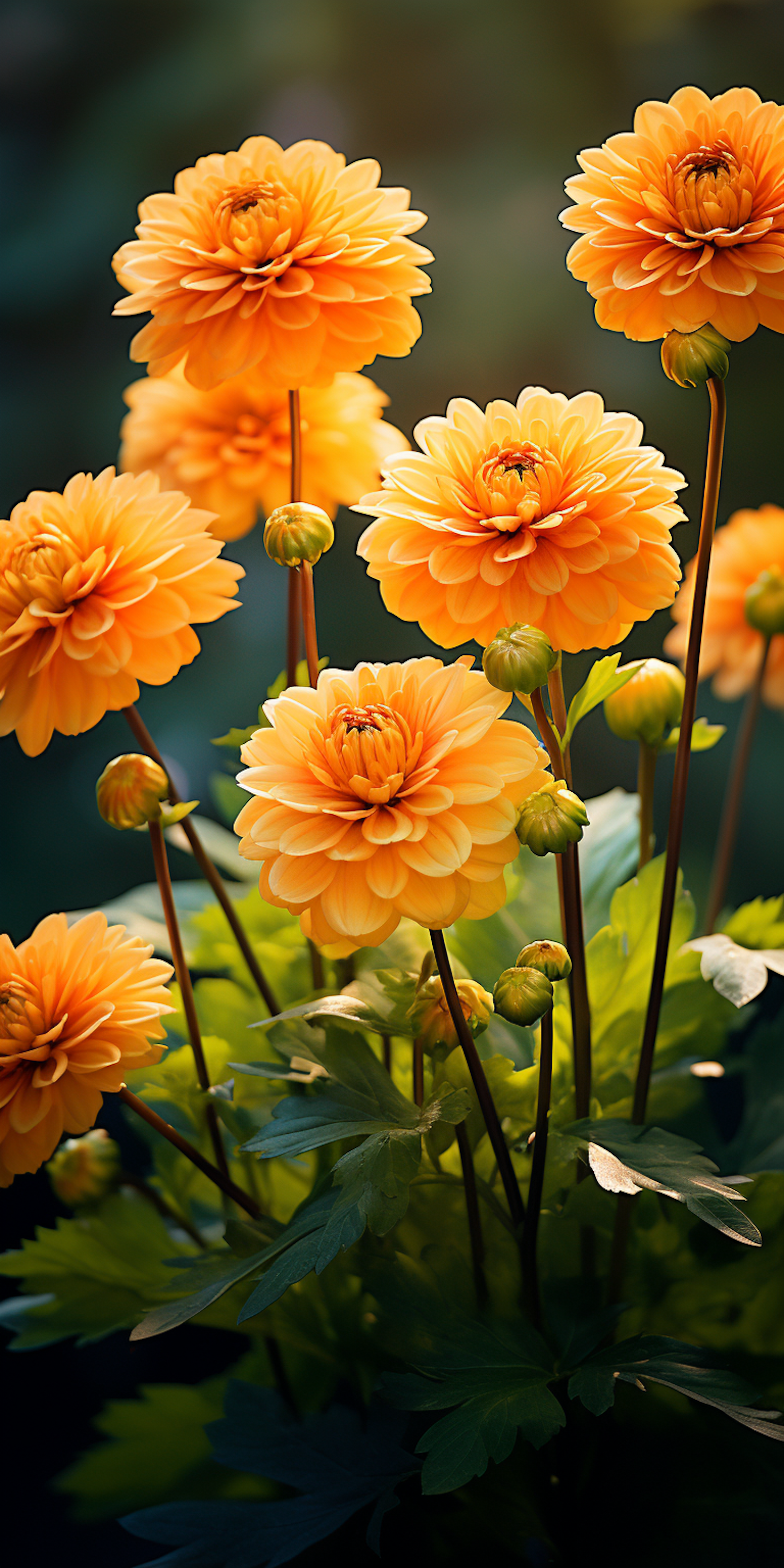 Vibrant orange dahlias in full bloom with lush green foliage, captured in warm natural light against a softly blurred background.