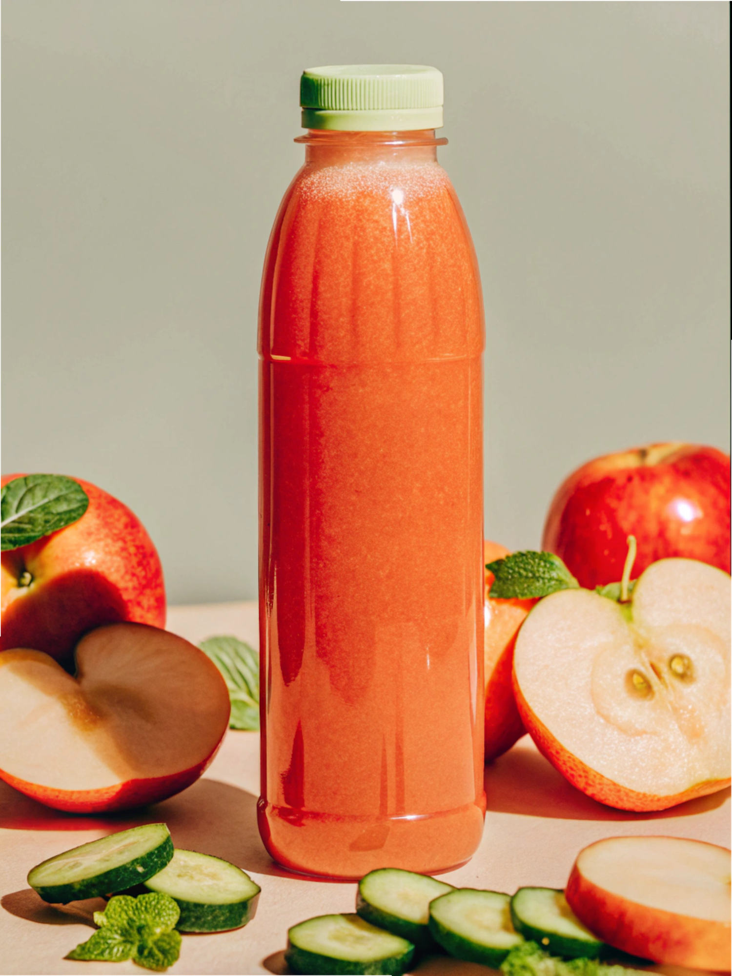Bright orange juice bottle with fresh apples, cucumber slices, and mint leaves on a neutral background. Perfect for a healthy lifestyle vibe.