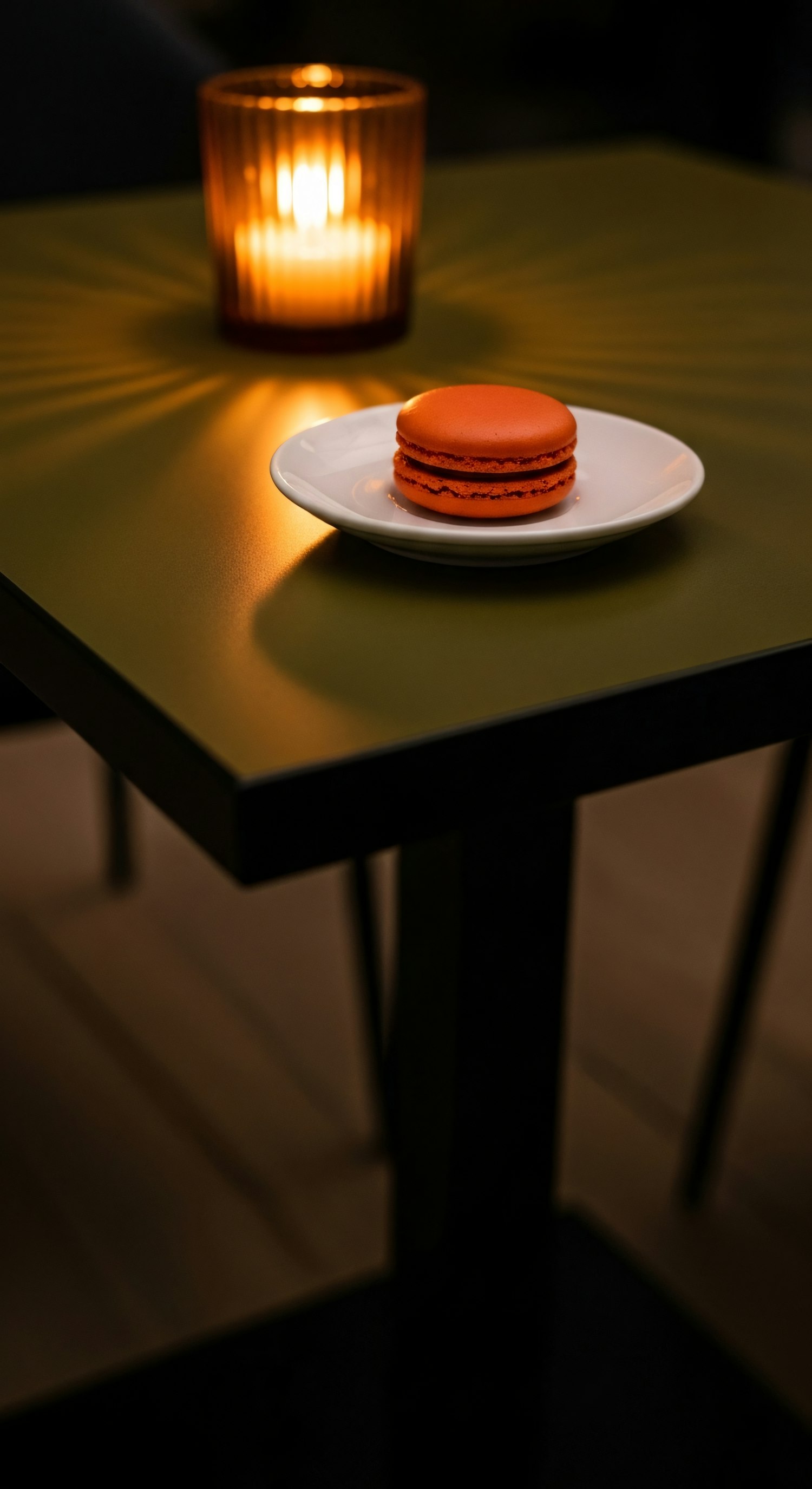 A cozy scene with an orange macaron on a white plate, lit by a glowing candle in a ribbed glass holder on a green table.