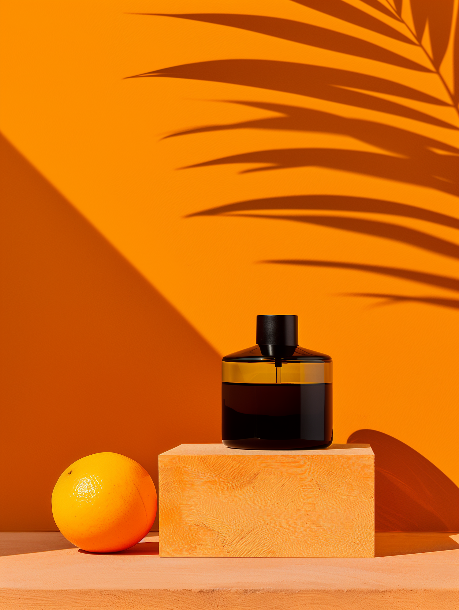 Minimalist scene with a black bottle and orange on a wooden block against a vibrant orange background with palm leaf shadows.