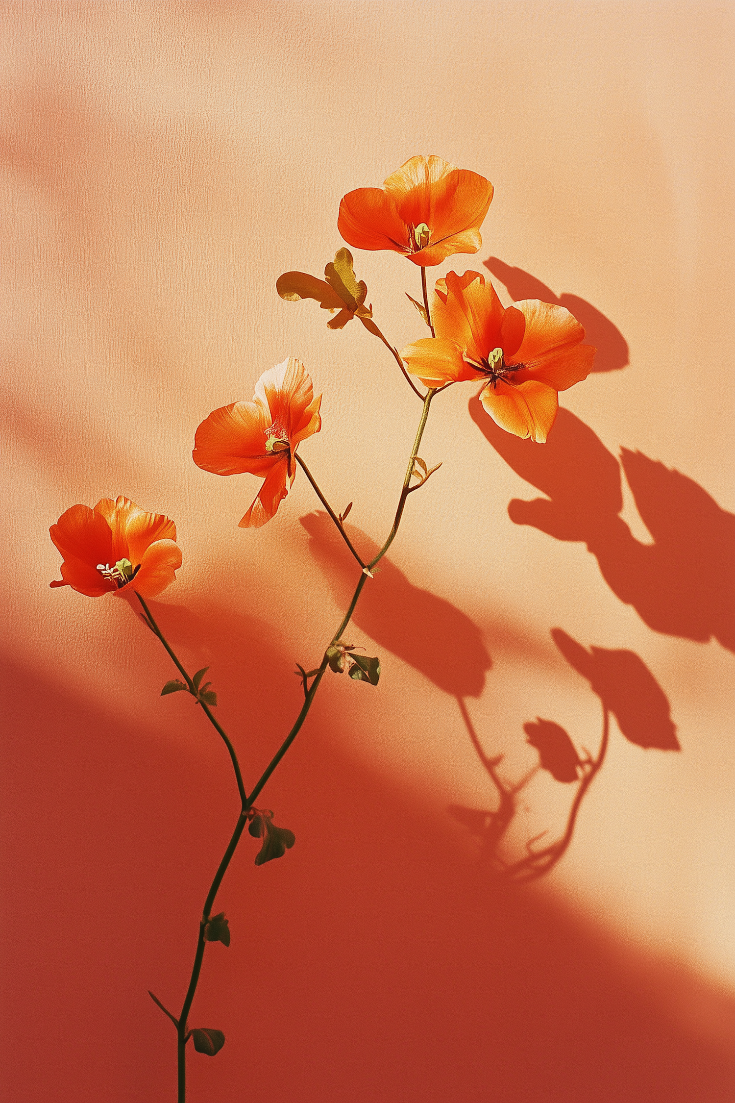 Vibrant orange poppy flowers on a peach background with dramatic shadows, creating a minimalist and artistic floral composition.