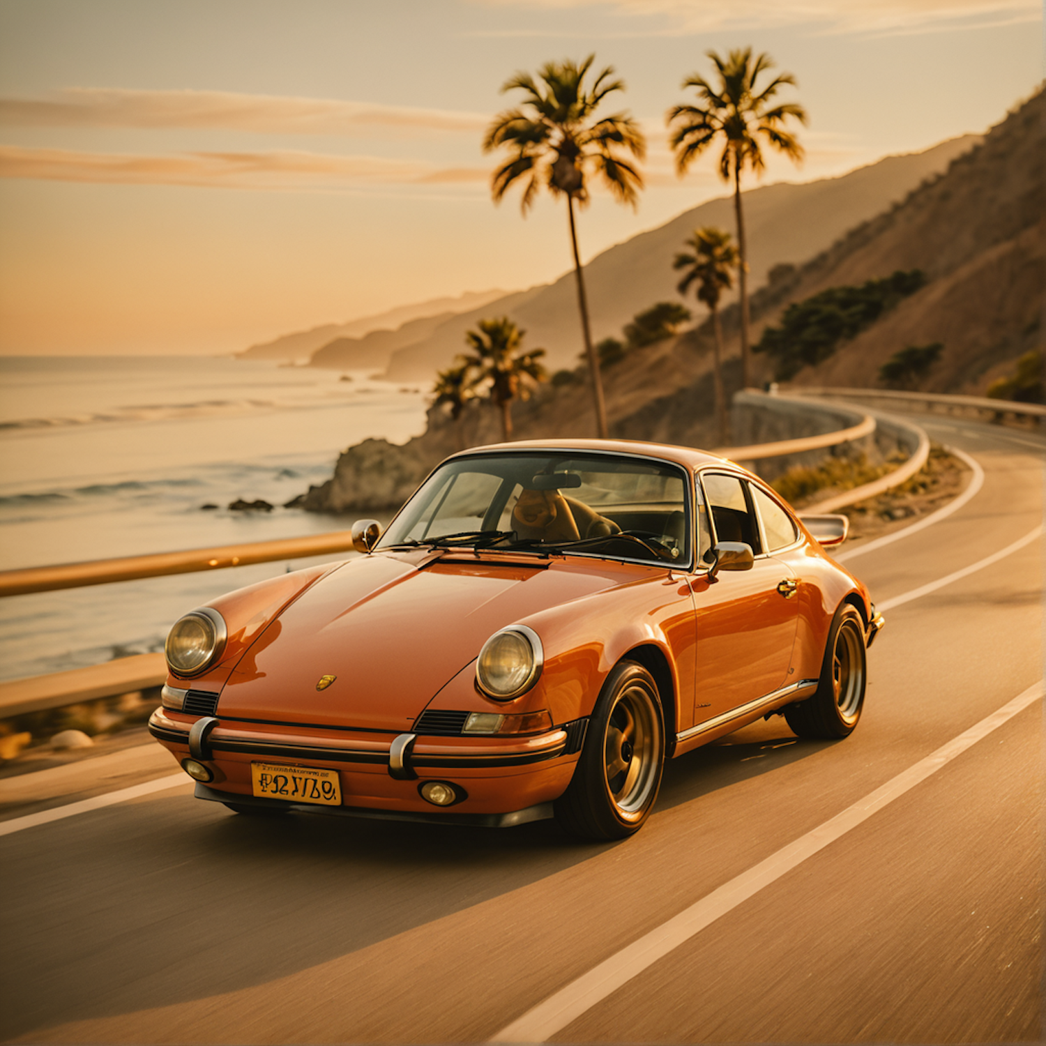 A vintage orange Porsche 911 drives along a coastal highway at sunset, with palm trees and ocean views creating a dreamy, nostalgic vibe.