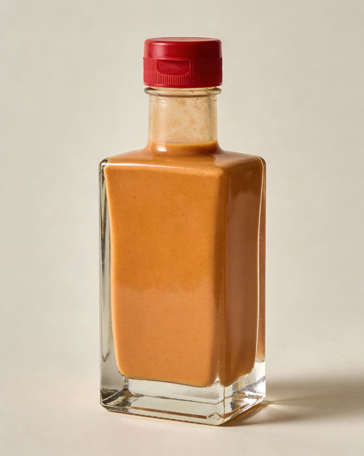 A clear glass bottle with a red cap, filled with a creamy orange sauce, set against a neutral background.