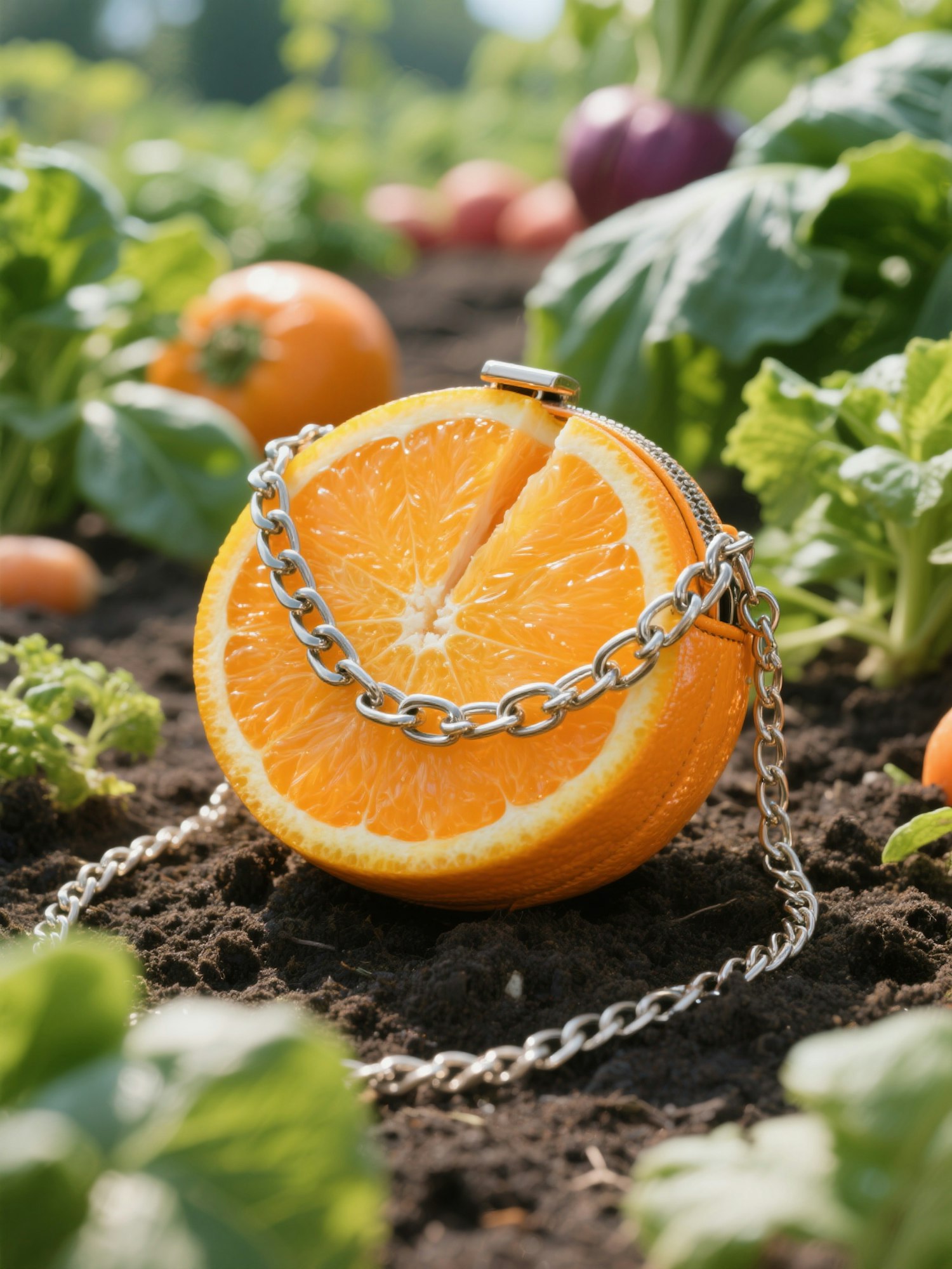 A sliced orange styled as a crossbody purse, complete with a metallic chain, in a vegetable patch