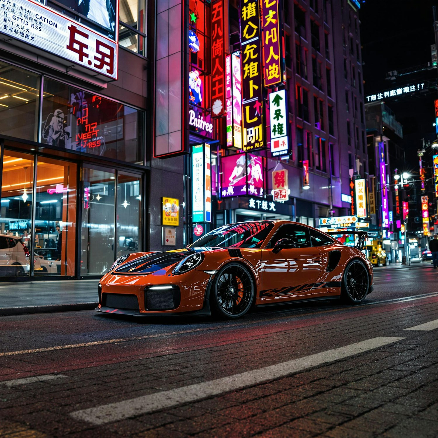 Orange sports car parked on a neon-lit urban street at night, surrounded by vibrant signs and reflections on the wet pavement.