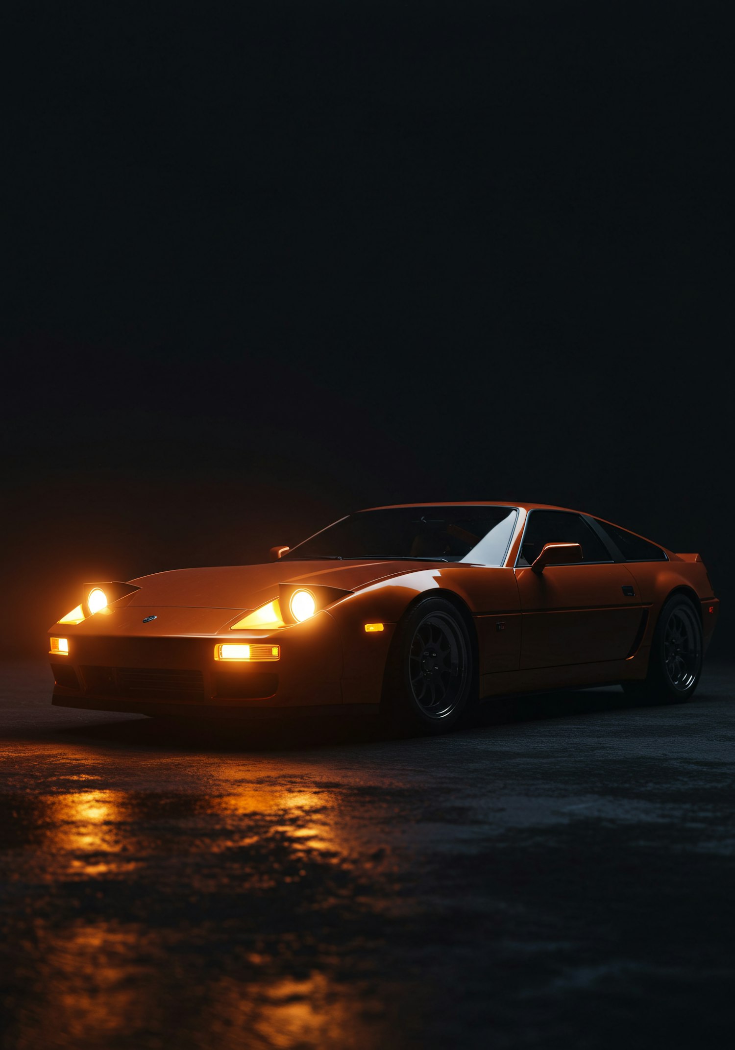 A stunning orange sports car with glowing headlights, parked on a wet surface in a dark, moody setting. Perfect for car enthusiasts.