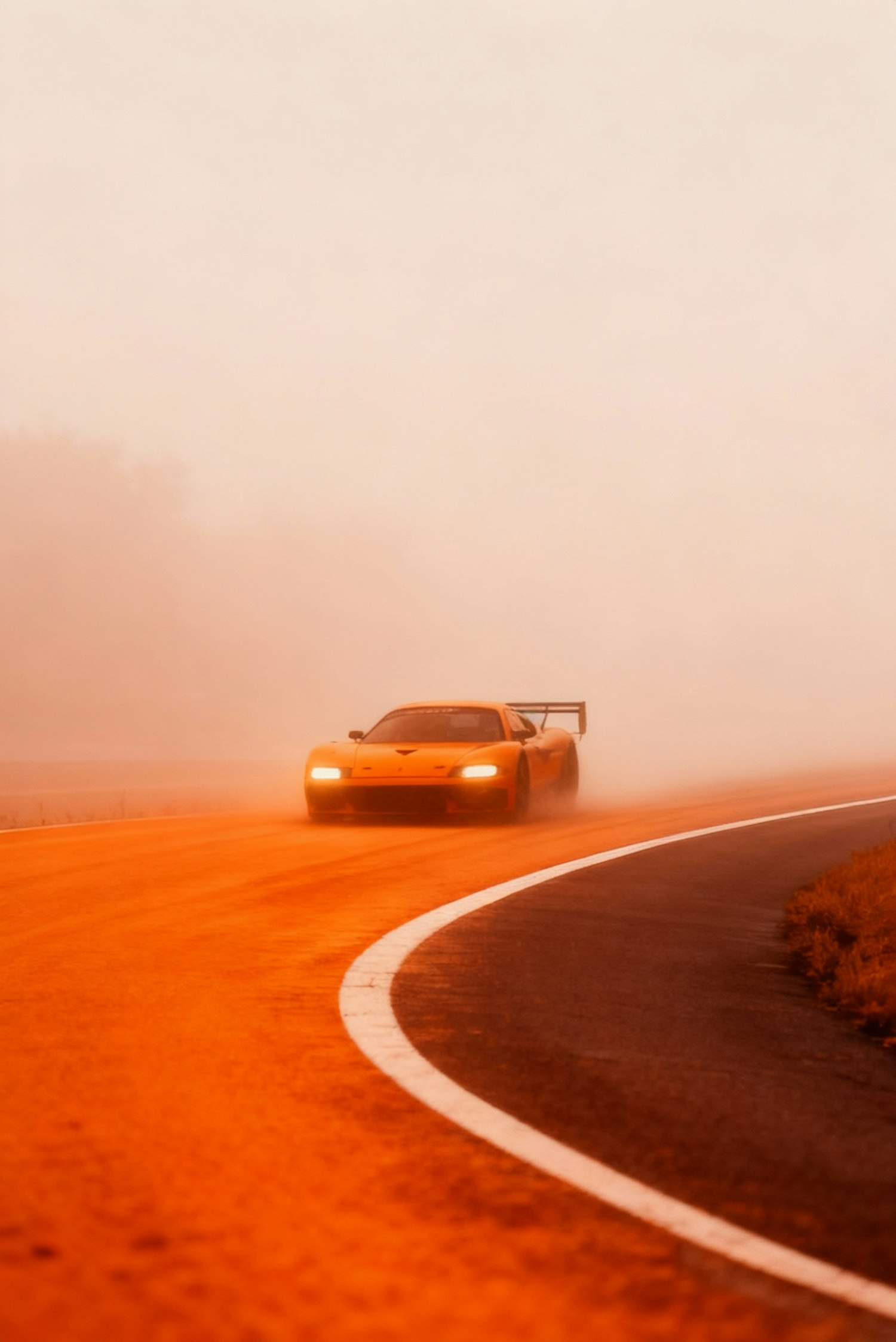 A vibrant orange sports car speeds through a foggy, curved road, its headlights cutting through the mist in a dramatic scene.