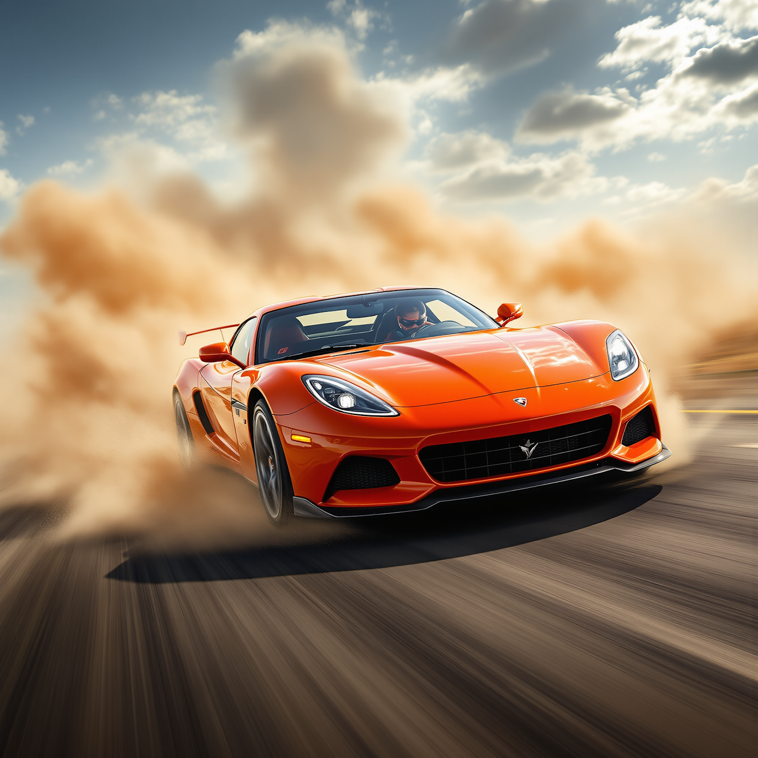 A sleek orange sports car racing on a track, creating a dramatic dust cloud, showcasing speed and performance.