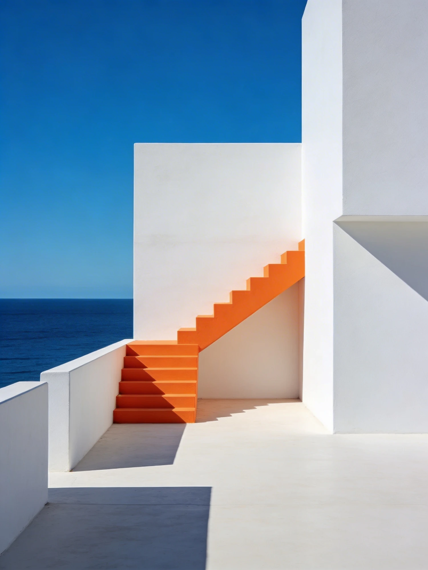 Minimalist architecture with an orange staircase against white walls, set against a blue sky and ocean backdrop. Clean and vibrant design.