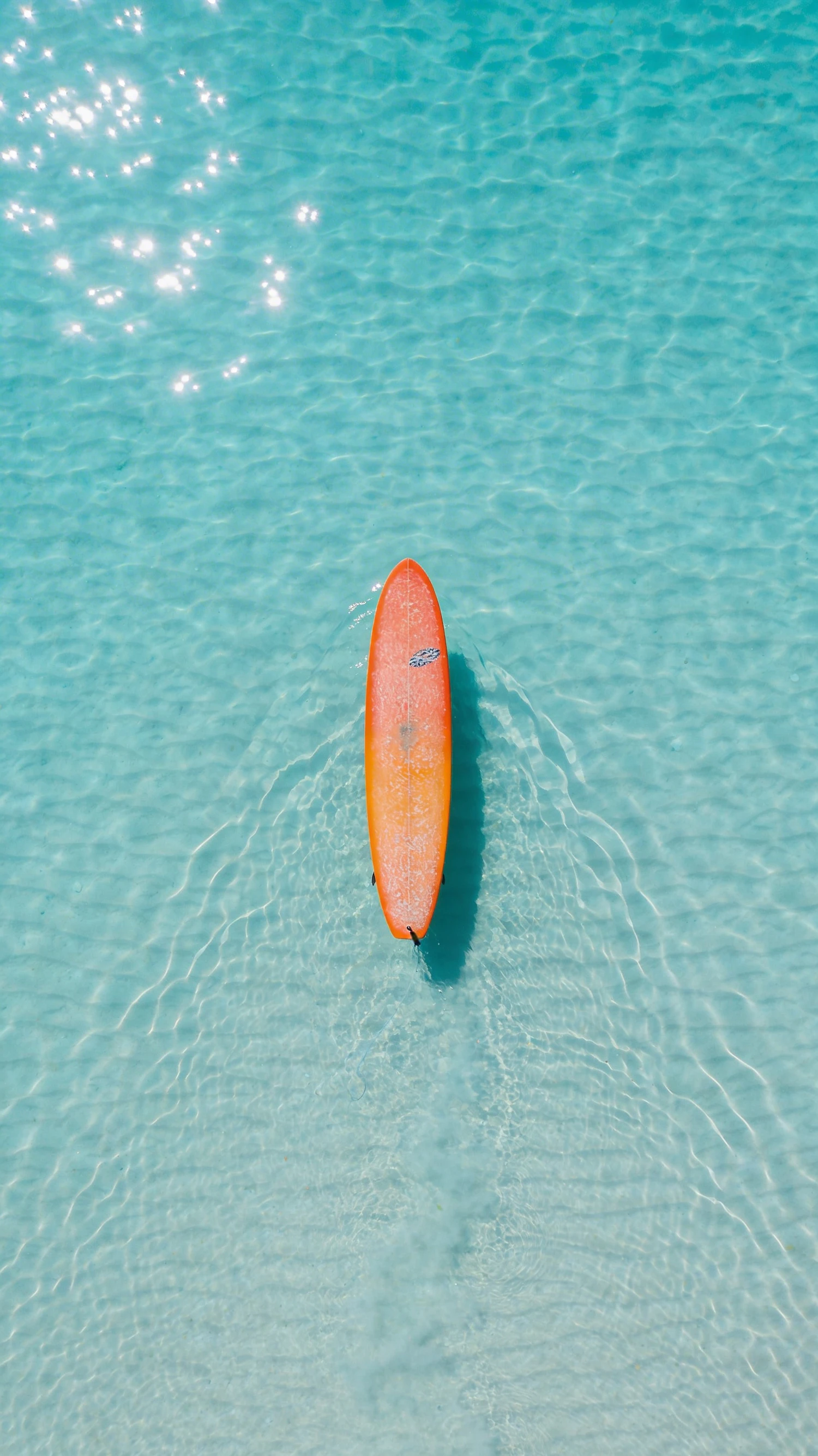 A bright orange surfboard floats on clear turquoise water, with sunlight reflecting off the surface, creating a serene tropical vibe.
