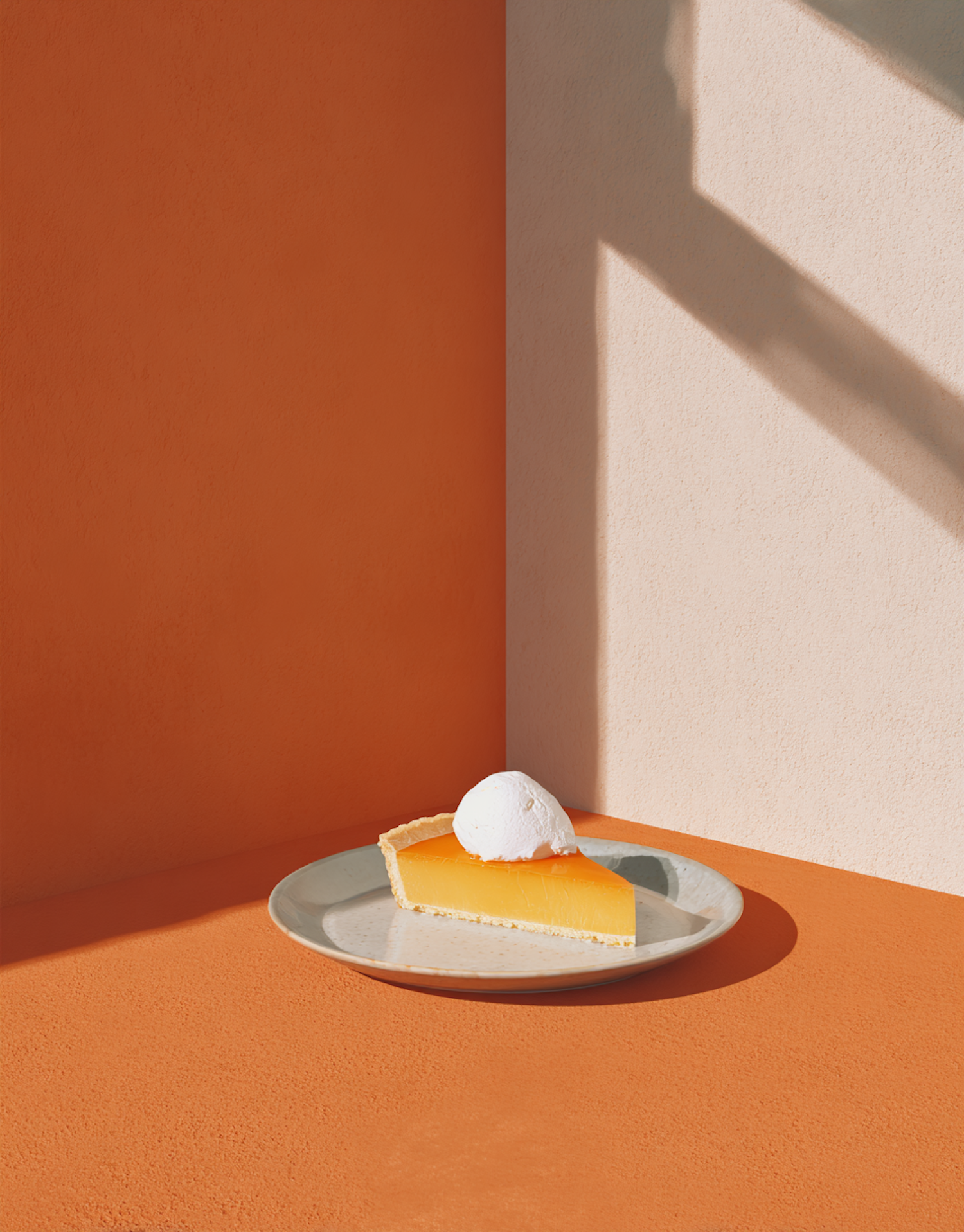 A luscious orange tart with whipped cream on a plate, set on a vibrant orange surface under soft sunlight with angular shadows.
