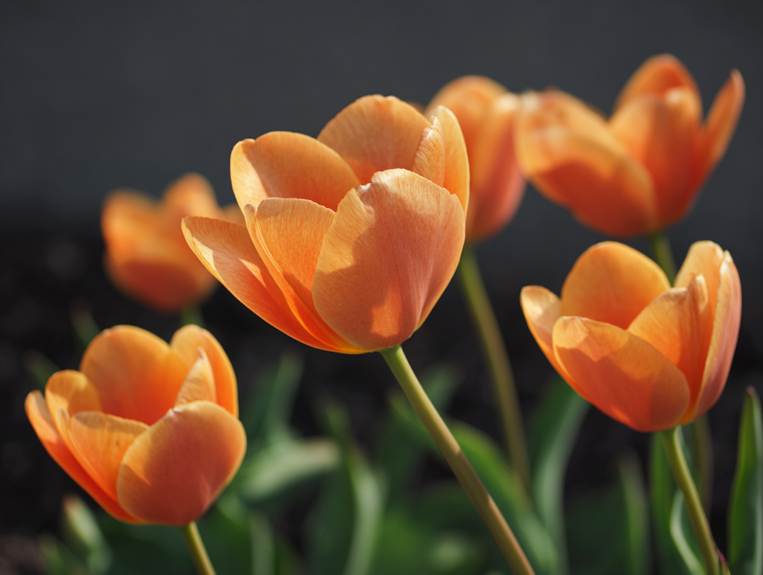 Bright orange tulips in full bloom under the sunlight, surrounded by green leaves and a smoothly blurred background.