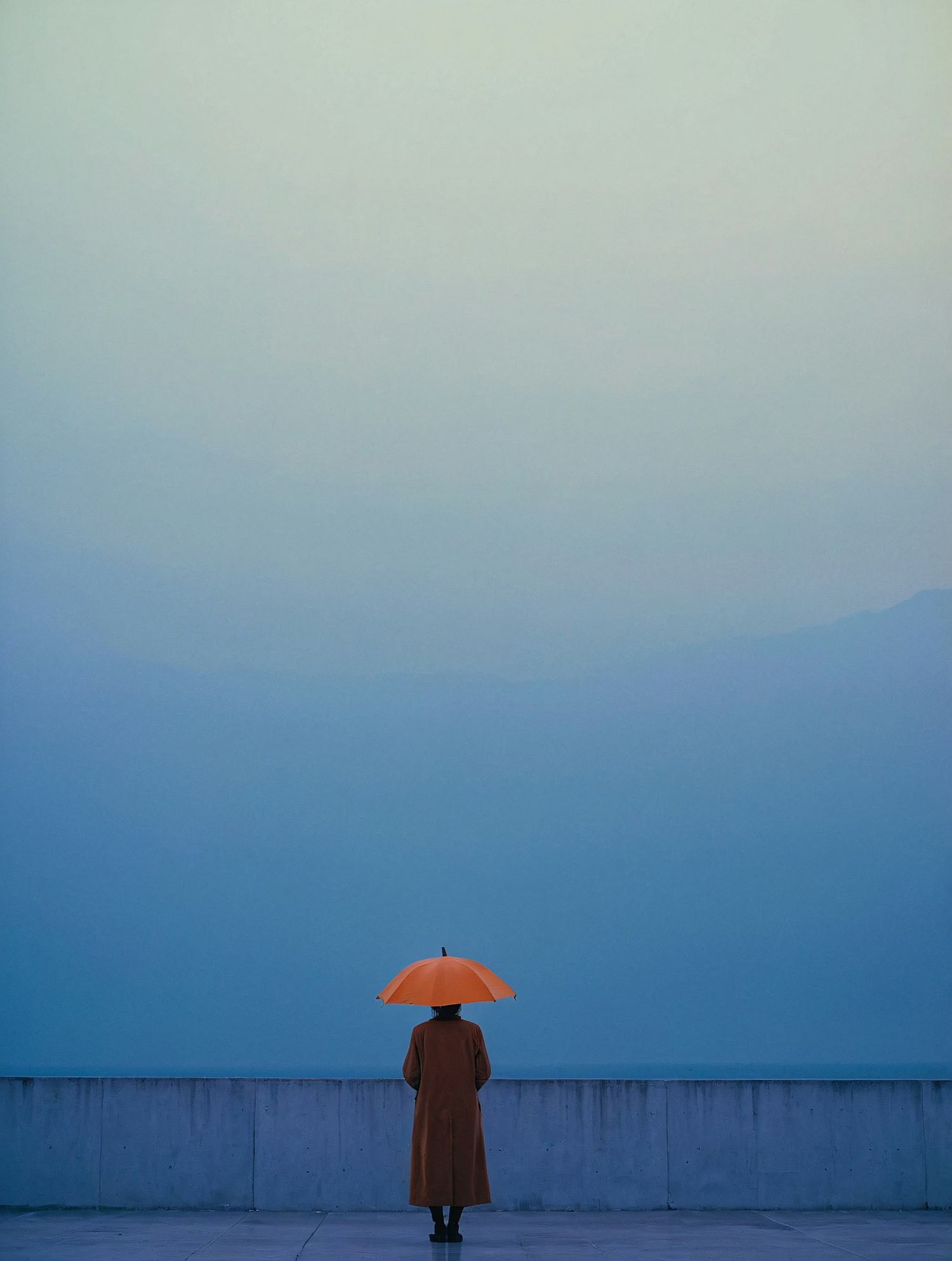 A person with an orange umbrella stands by a concrete wall under a foggy blue sky, creating a minimalist and introspective scene.