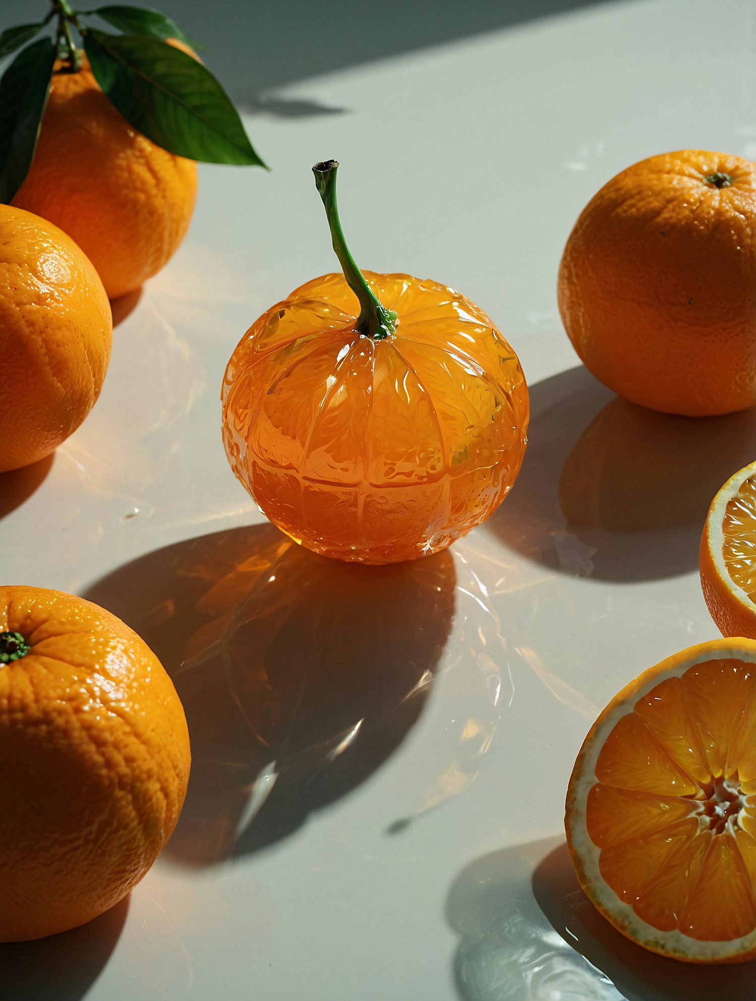 Vibrant oranges and a glass sculpture on a glossy surface, with sunlight creating intricate reflections and shadows.