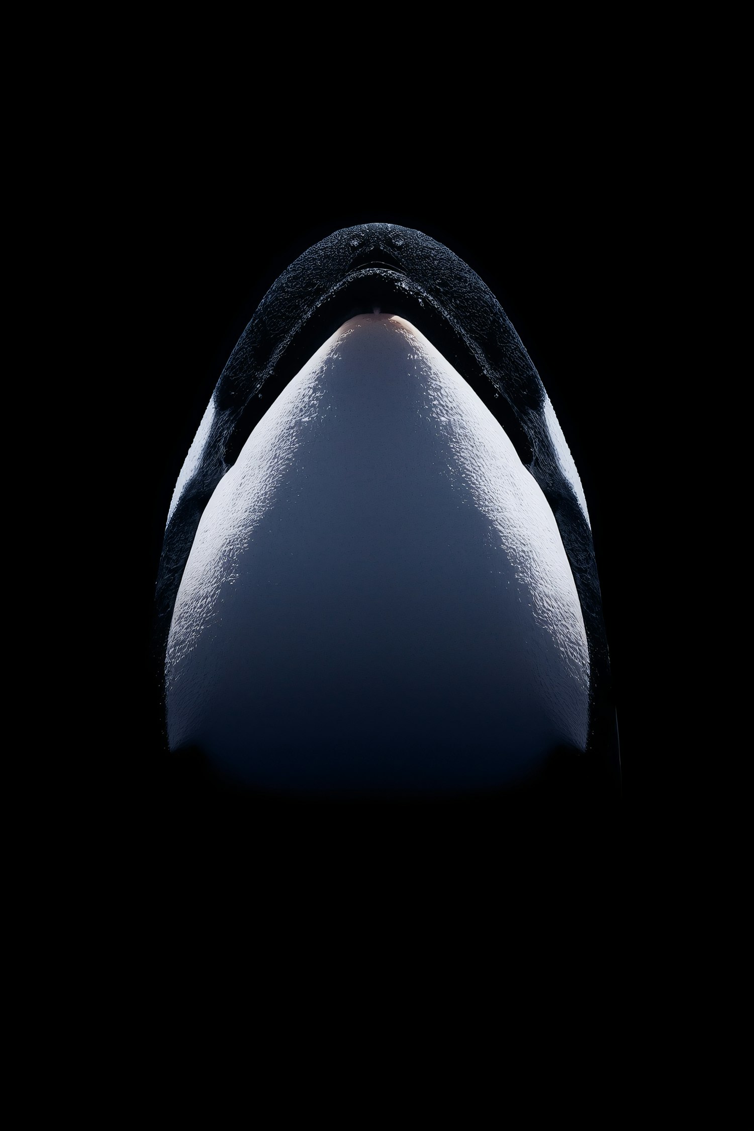 Close-up of an orca's head from below, highlighting its black and white skin texture against a black background.