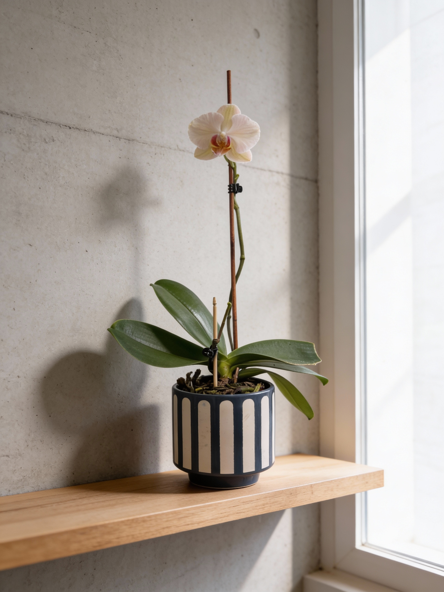A single orchid in a striped pot sits on a wooden shelf by a window, with sunlight casting soft shadows on the concrete wall.