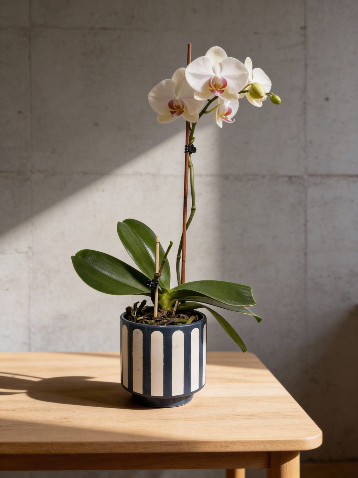 A beautiful orchid in a striped pot on a wooden table, illuminated by natural light against a minimalist concrete wall.